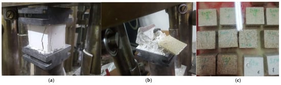 A Universal Testing Machine was used for the testing of samples to assess their mechanical durability against compression forces (Figure 3a,b) and elasticity applying the methodology described in the standards ASTM C 349-02 [31] and ASTM C 469-02e1 [32], respectively. According to the applied standards and literature, 10 samples/category of material have been tested for compression strength and elasticity test to assess mean and standard deviation values.