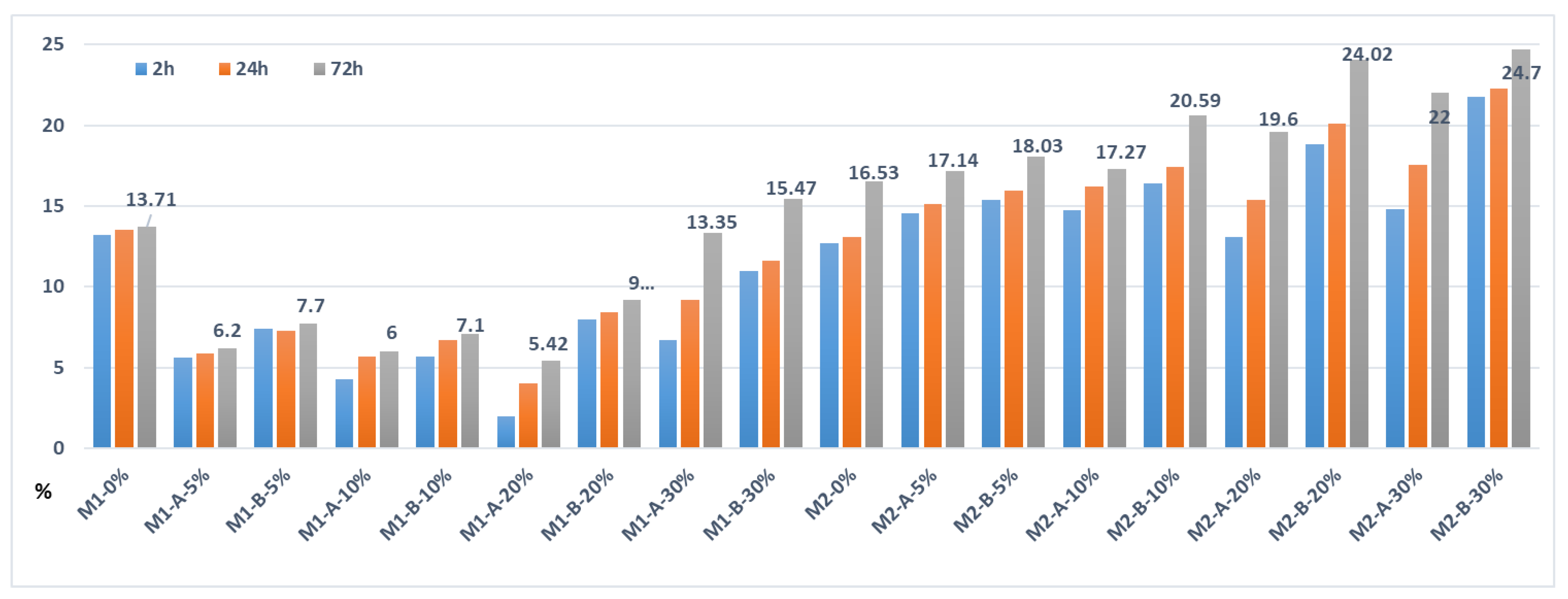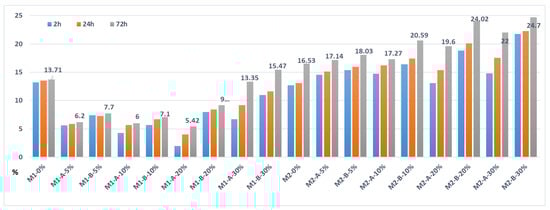 In the following, the diagram of Figure 6 shows the mean values of water absorption recorded after the immersion of the samples for 2, 24 and 72 h in tap water. As is evident, comparing the mean absorption values of the samples, there are obvious differences between mortar 1 (M1) specimens and the rest prepared with mortar 2 (M2). In parallel, the difference in absorption values of the samples with the highest percentages of bark (20% and 30%) is of particular interest, since, as the bark percentage increases, the absorption also seems to increase, with tree-of-heaven to exhibit a significantly lower absorption percentage in both cases of mortars (Figure 7). Therefore, the samples of the reference material of the two mortars employed showed a relatively low, not statistically significant difference in absorption values, as mortar M1 recorded a slightly lower absorption percentage. Excluding the reference material, at 20% and 30% of bark introduction, the absorption of the samples of mortar 2 (M2) was found to be higher on both the tree-of-heaven and the black locust. In the samples with a bark percentage of 5% and 10%, the absorption values fluctuated to similar levels without marking statistically significant differences.