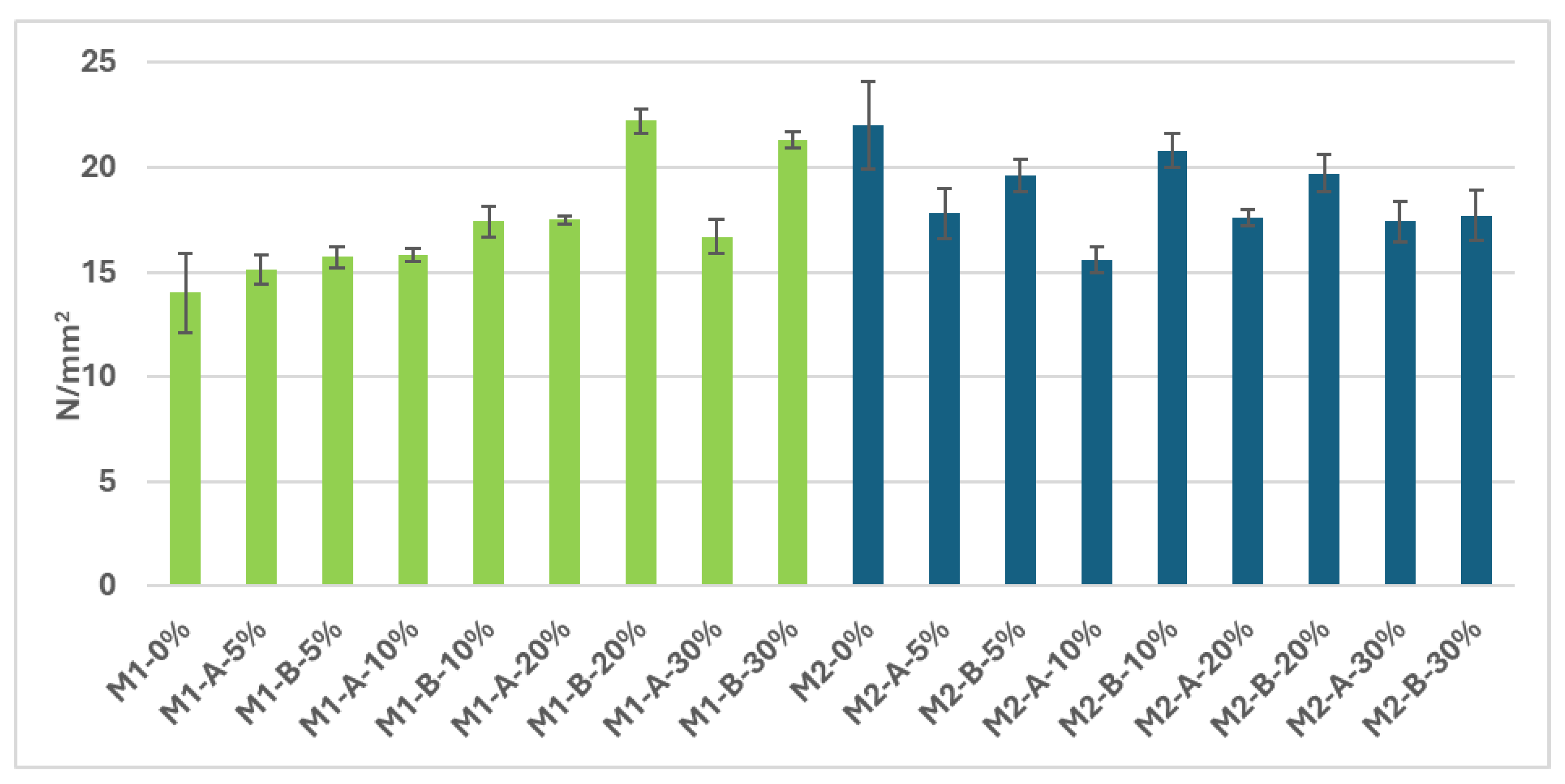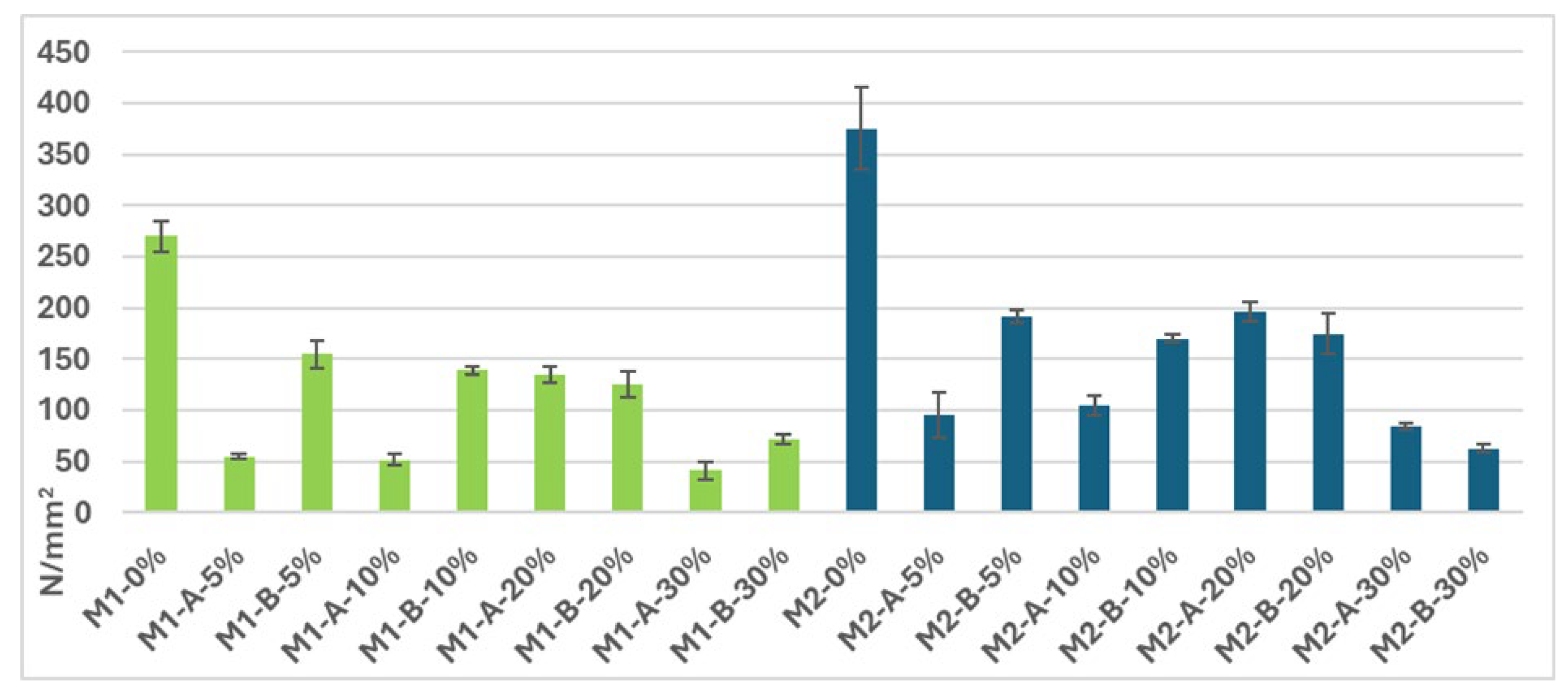 Statistical analysis of the research results concerning compressive strength of the bark–lime composites of M1, proved significant differences between average values of the following composites categories presented in Table A1 (multiple pairwise comparison results): M1-Black locust-20% Bark (M1-B-20%) and M1-B-30% with all the other categories of M1 mortar material. M1-B-10% differed significantly from the categories of reference material (M1-0%) and those categories of both species bark at 5% (M1-A-5%, M1-B-5%), as well as the category of tree-of-heaven-10% (M1-A-10%). As regards M2 mortar material samples, the composite categories of M2-A-5%, M2-A-20%, M2-A-30% and M2-B-30% exhibited similar values, while all these categories marked statistically significant differences from the categories of reference material (M2-0%), M2-B-5%, M2-B-10% and M2-B-20% (Appendix, Table A1).