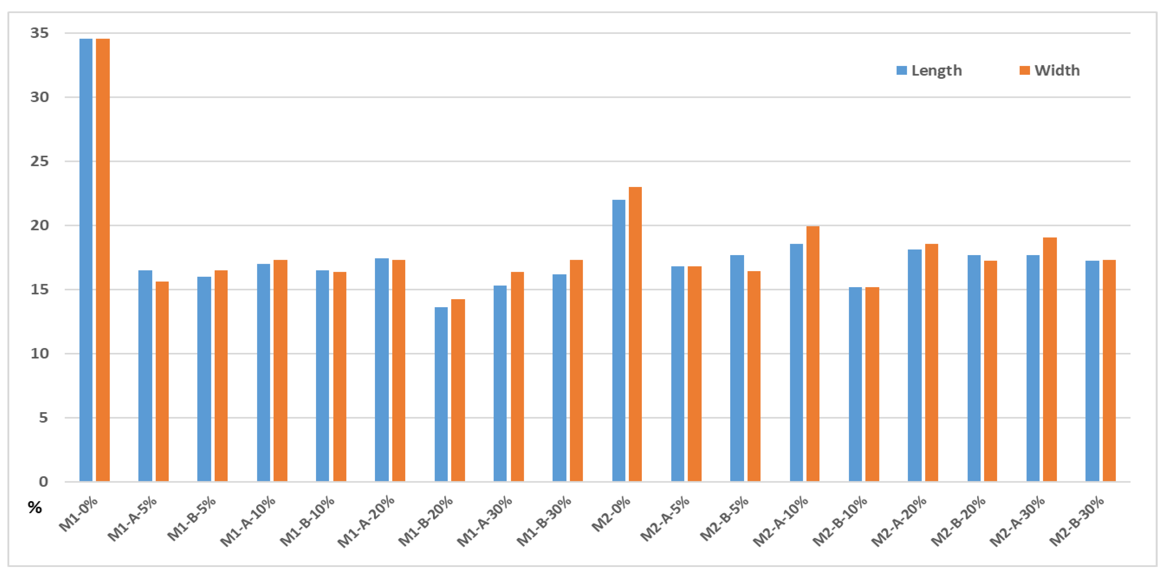 The differences between the categories of the samples are visible but certainly not statistically significant, apart from the case of differences from the reference of mortar 1 (M1) category. In the rest of the categories, the samples containing tree-of-heaven bark showed a slight increasing trend in all percentages compared to the samples with black locust bark, though without marking statistically significant differences among the mean values of swelling (%). In parallel, among the samples of the same categories, it is obvious that the swelling percentage values difference is negligible, as concerns the length or width of the samples, while in some cases not no increase in their length dimensions was observed, even though there were differences in absorption values of specimens.