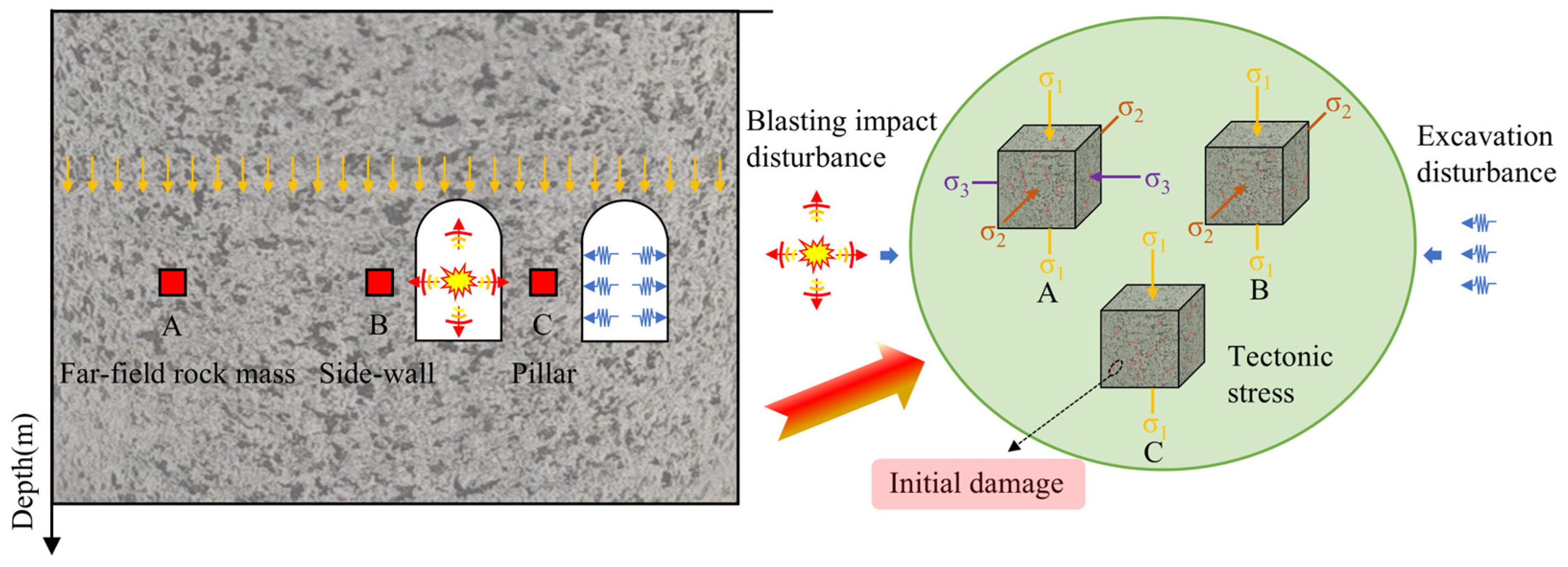 - Yan, P.; Lu, W.-b.; Chen, M.; Hu, Y.-g.; Zhou, C.-b.; Wu, X.-x. Contributions of In-Situ Stress Transient Redistribution to Blasting Excavation Damage Zone of Deep Tunnels. Rock Mech. Rock Eng. 2015, 48, 715–726. [Google Scholar] [CrossRef]