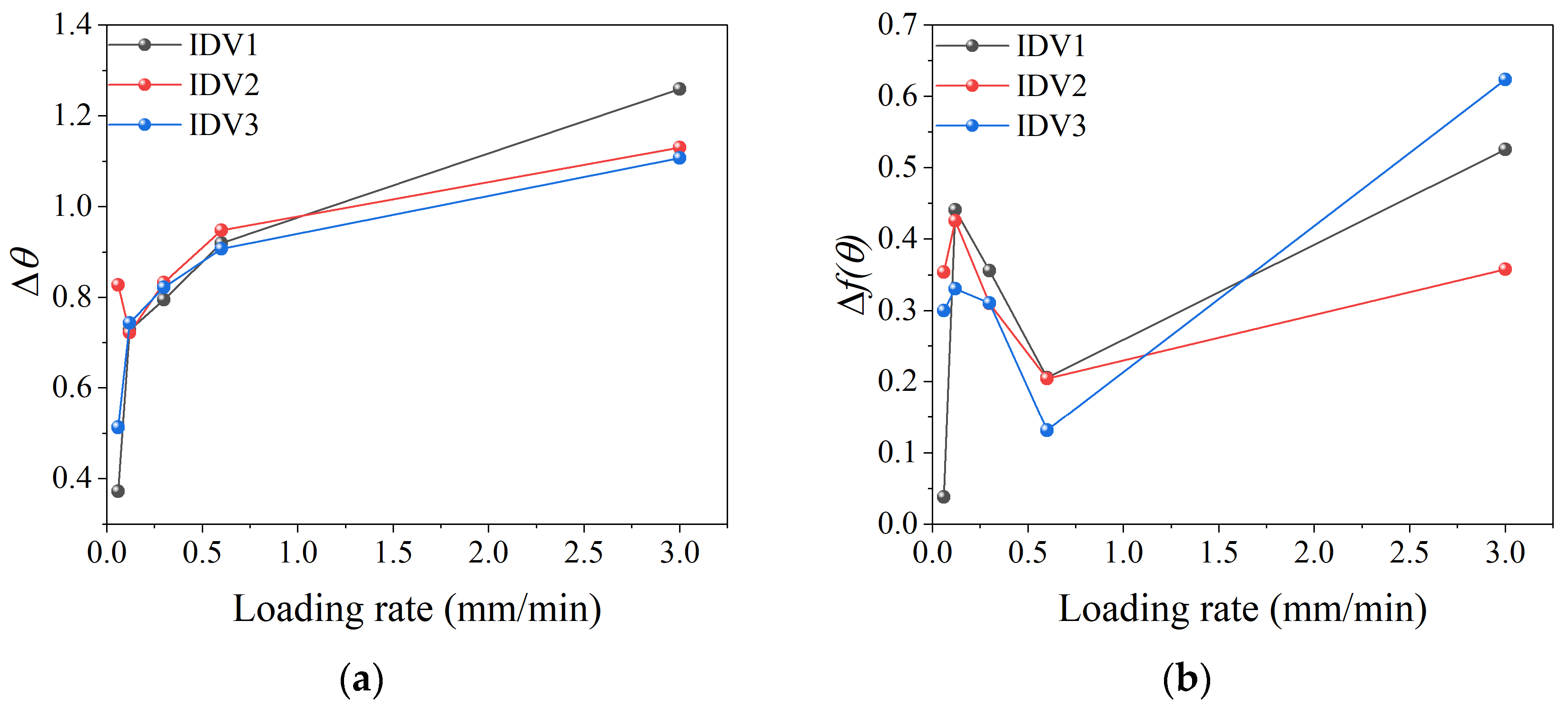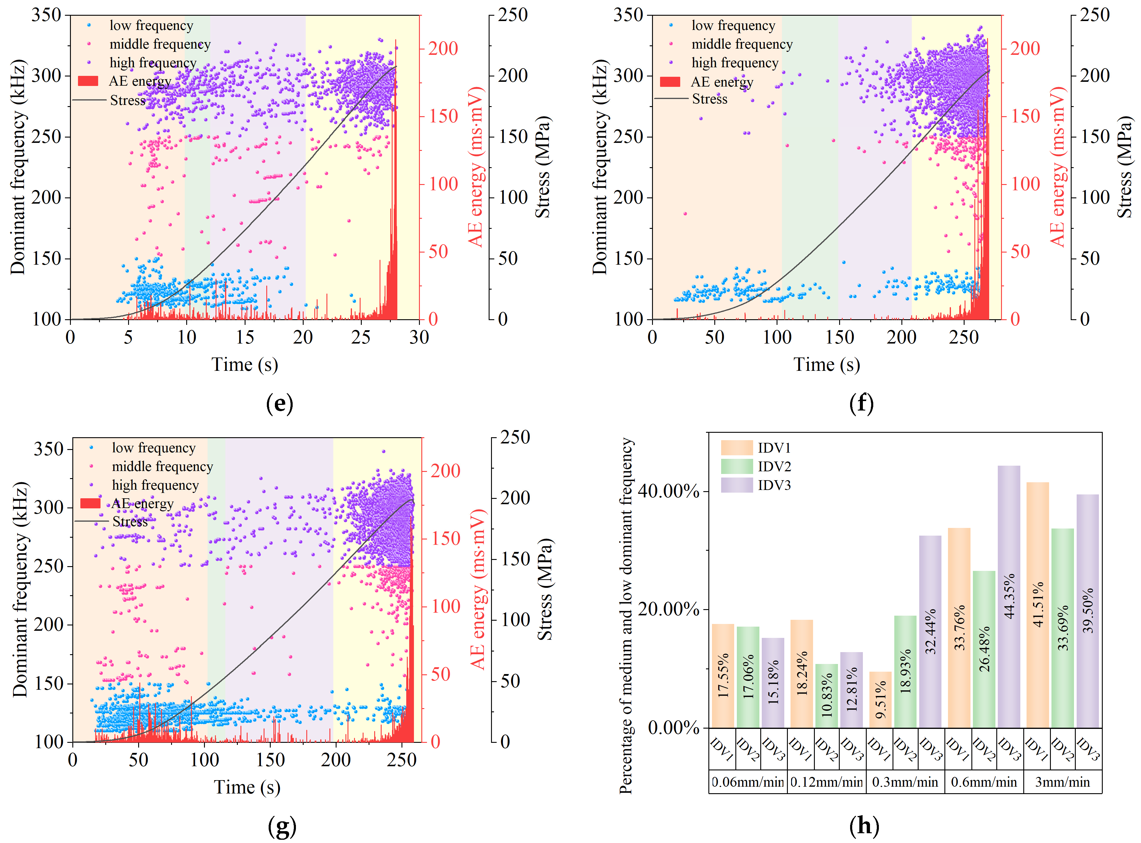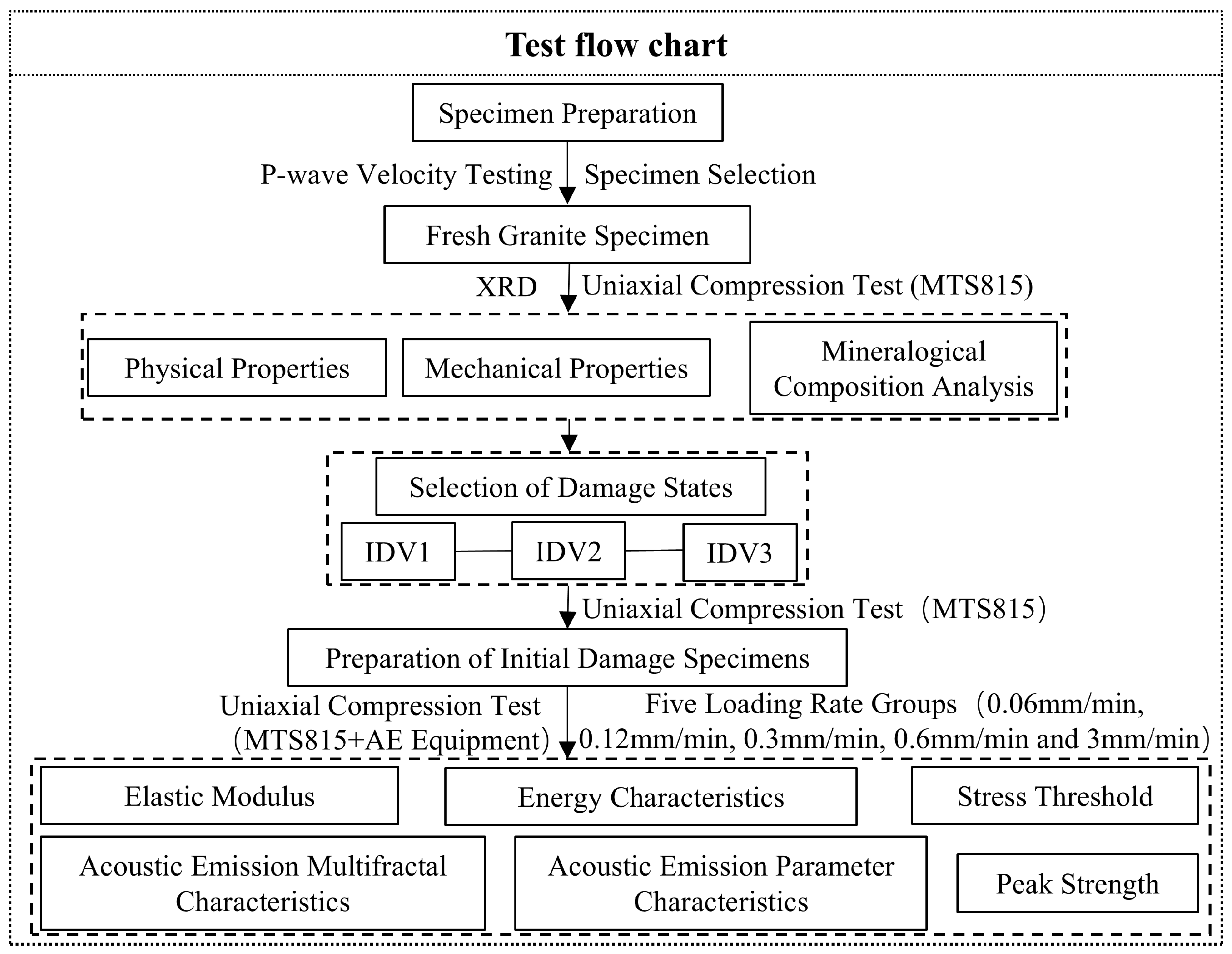 - The AE counts, RA/AF values, b-values, and entropy of all IDGSs exhibit pronounced stage-dependent features and contain precursory information for rock failure. Initial damage mainly affects crack activity during the compaction stage. The proportion of mid and low dominant frequencies varies with loading rate in the same trend as peak strength. AE time-series data display multifractal characteristics. With increasing loading rate, Δθ generally rises, while Δf follows an N-shaped trend.