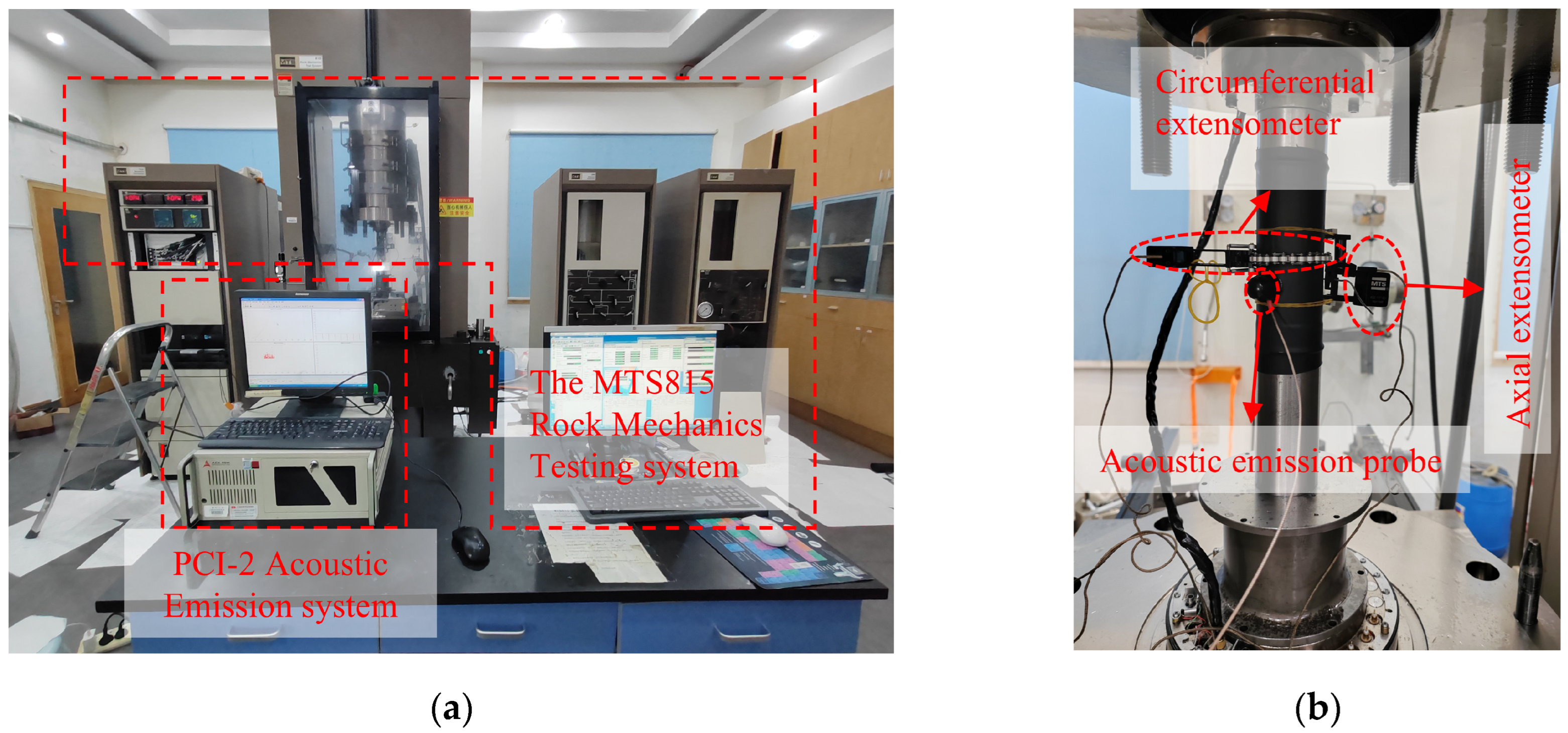 - Zhang, L.M.; Ma, S.Q.; Ren, M.Y.; Jiang, S.Q.; Wang, Z.Q.; Wang, J.L. Acoustic emission frequency and b value characteristics in rock failure process under various confining pressures. Chin. J. Rock Mech. Eng. 2015, 34, 2057–2063. [Google Scholar]