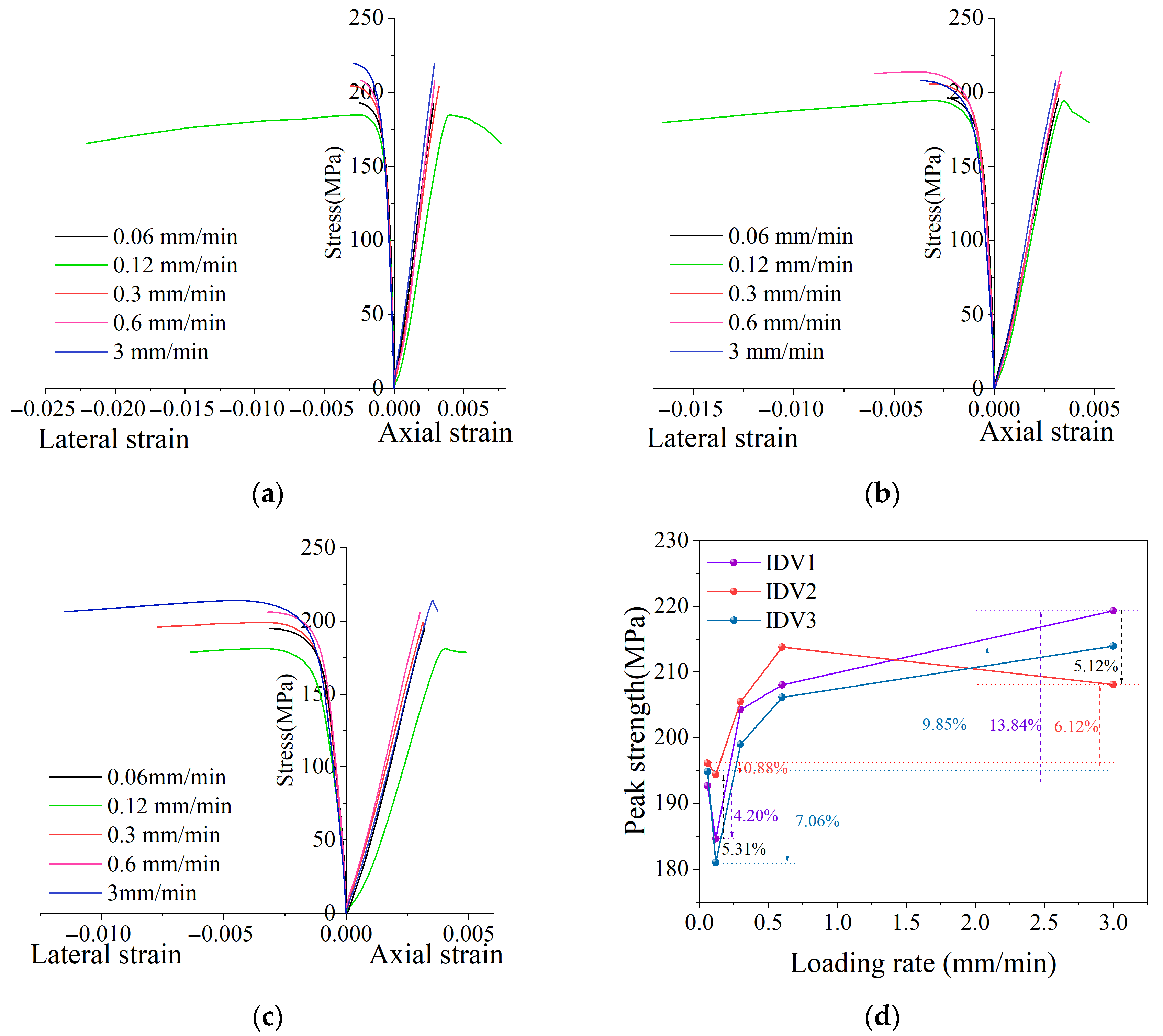 3.1.1. Evolution of Stress–Strain Behavior and Peak Strength