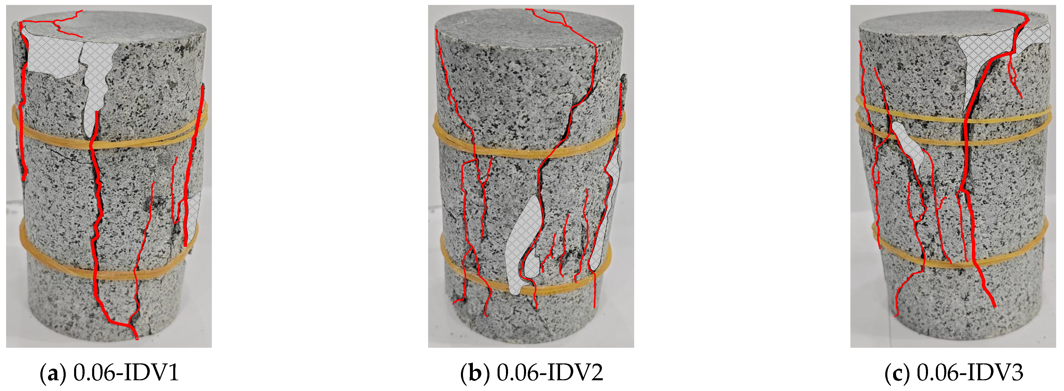 - Liang, C.Y.; Wu, S.R.; Li, X.; Xin, P. Effects of strain rate on fracture characteristics and mesoscopic failure mechanisms of granite. Int. J. Rock Mech. Min. Sci. 2015, 76, 146–154. [Google Scholar] [CrossRef]