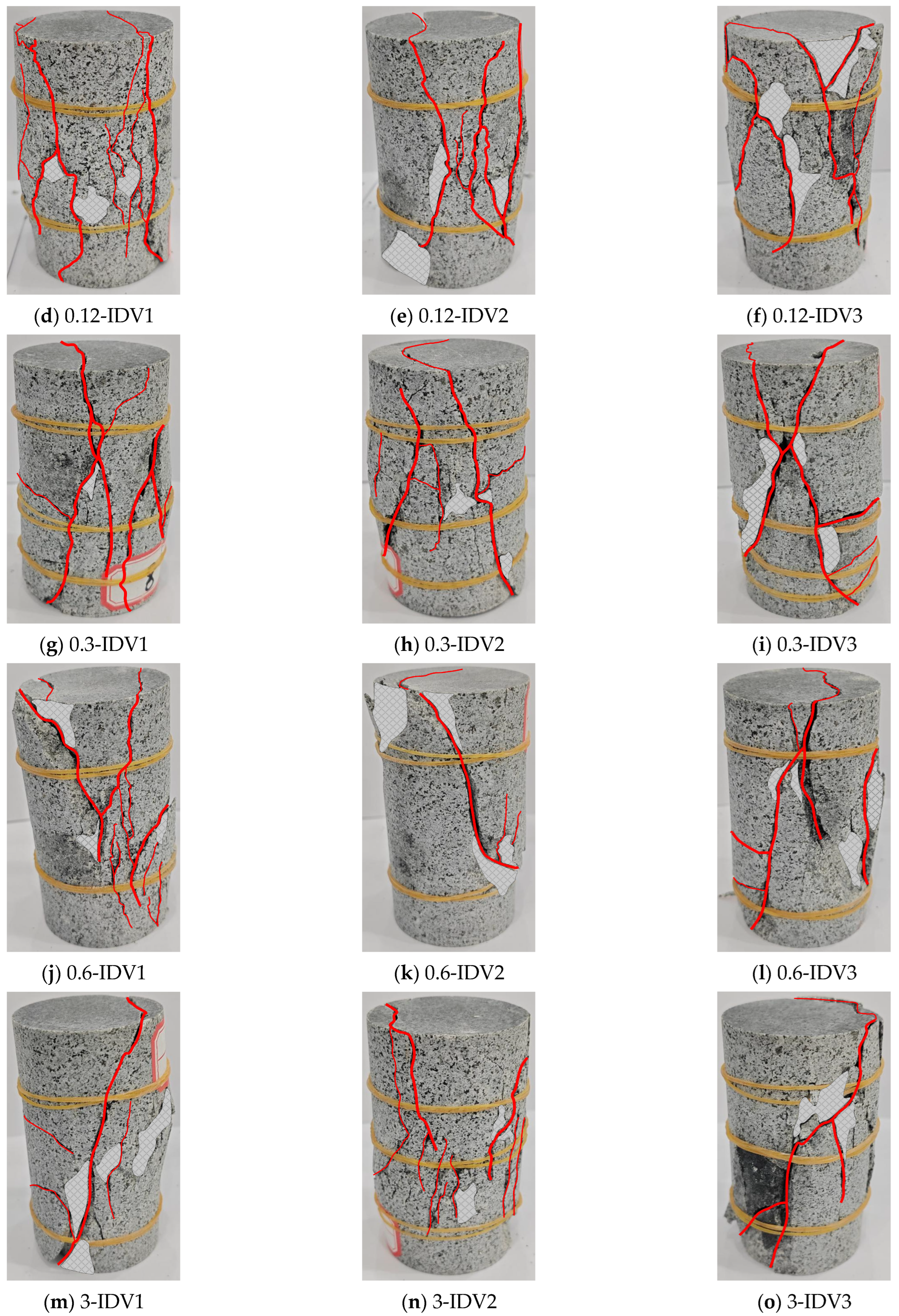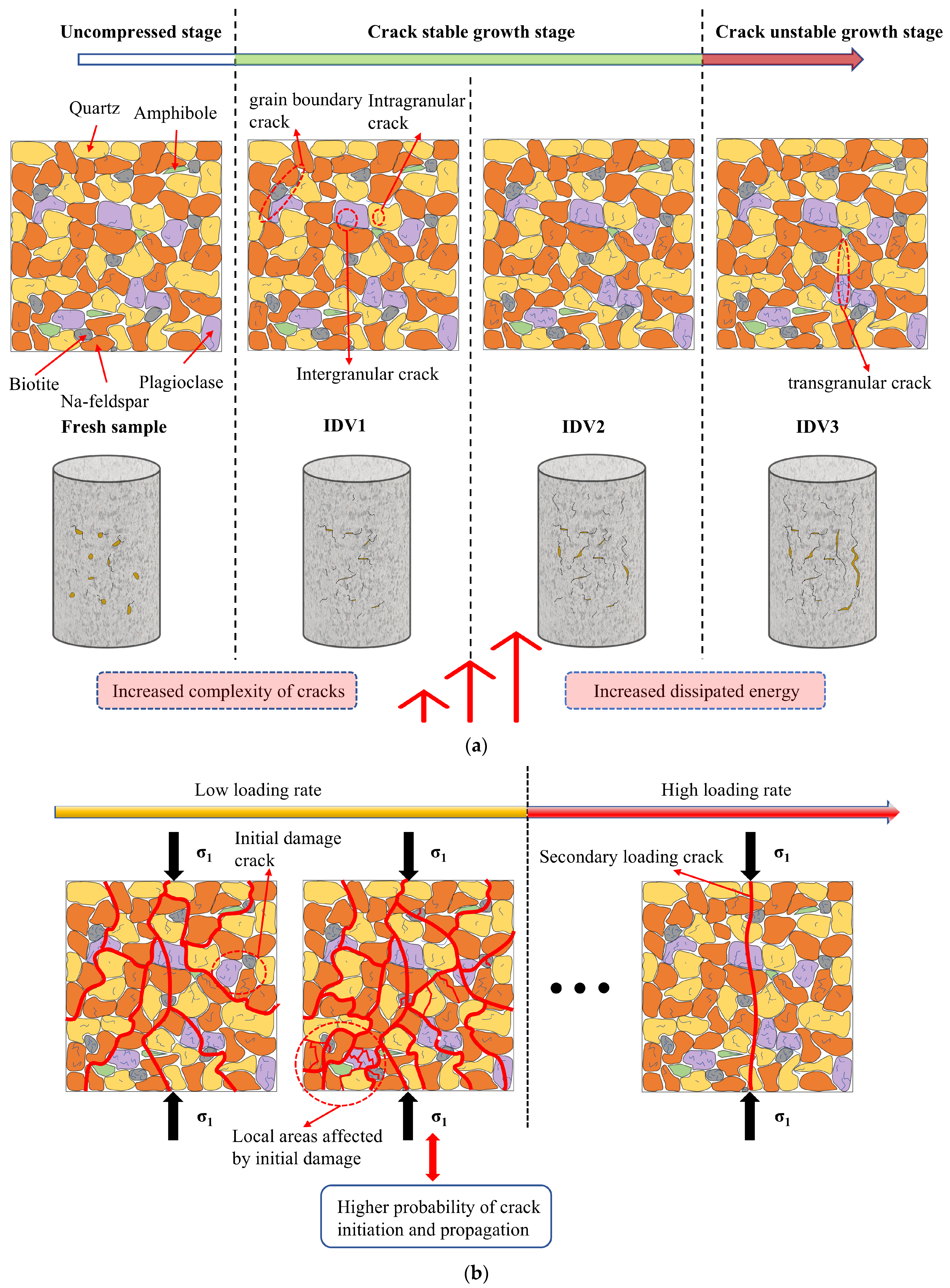 - The interactive effects of initial damage and loading rate on granite mechanical behavior are elucidated. Higher initial damage increases microcrack complexity and alters crack numbers. This mainly affects local and compaction-stage crack activity, while the loading rate controls the primary modes and numbers of crack initiation and propagation. Loading rate and mineral heterogeneity, specifically grain size and spatial arrangement, primarily govern granite’s mechanical properties and fracture characteristics, while initial damage has a limited influence.