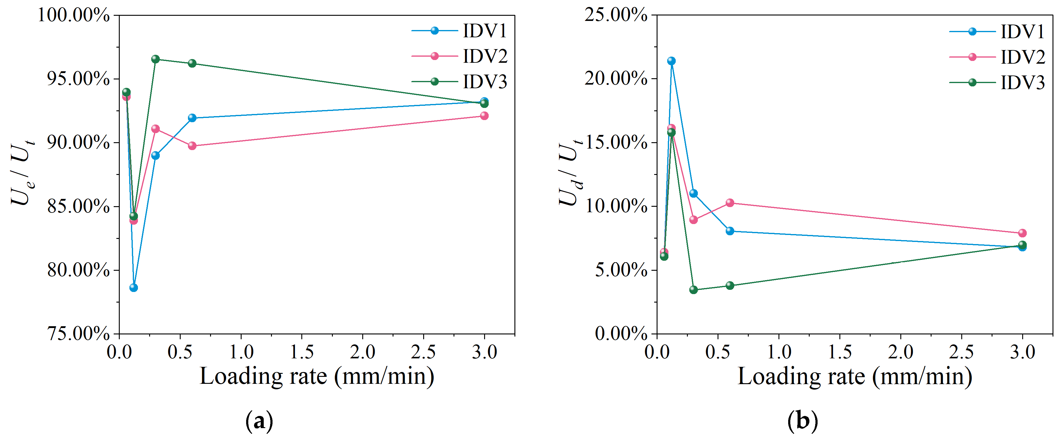 - Granite exhibits an initial reduction followed by a subsequent increase in both strength and elastic modulus as the loading rate rises. Specifically, the peak strength reaches its minimum at 0.12 mm/min and its maximum at 3 mm/min, with a decrease of approximately 4.04% and an increase of about 9.94%, respectively, compared to 0.06 mm/min. An increase in loading rate leads to strength weakening, which opposes the conventional behavior of enhanced strength at higher strain rates. At the minimum strength, Ud/Ut peaks while Ue/Ut reaches its lowest value. The underlying reason is that when cracks have adequate time to evolve, elevated loading rates promote both crack initiation and propagation. Strength and elastic modulus are minimally influenced by initial damage, with UCS variations ranging from −5.12% to +5.31% across different damage levels. At higher loading rates, the dependence of stress thresholds on initial damage weakens. The IDGS failure pattern is largely dictated by loading rate, with only minor influence from initial damage levels.