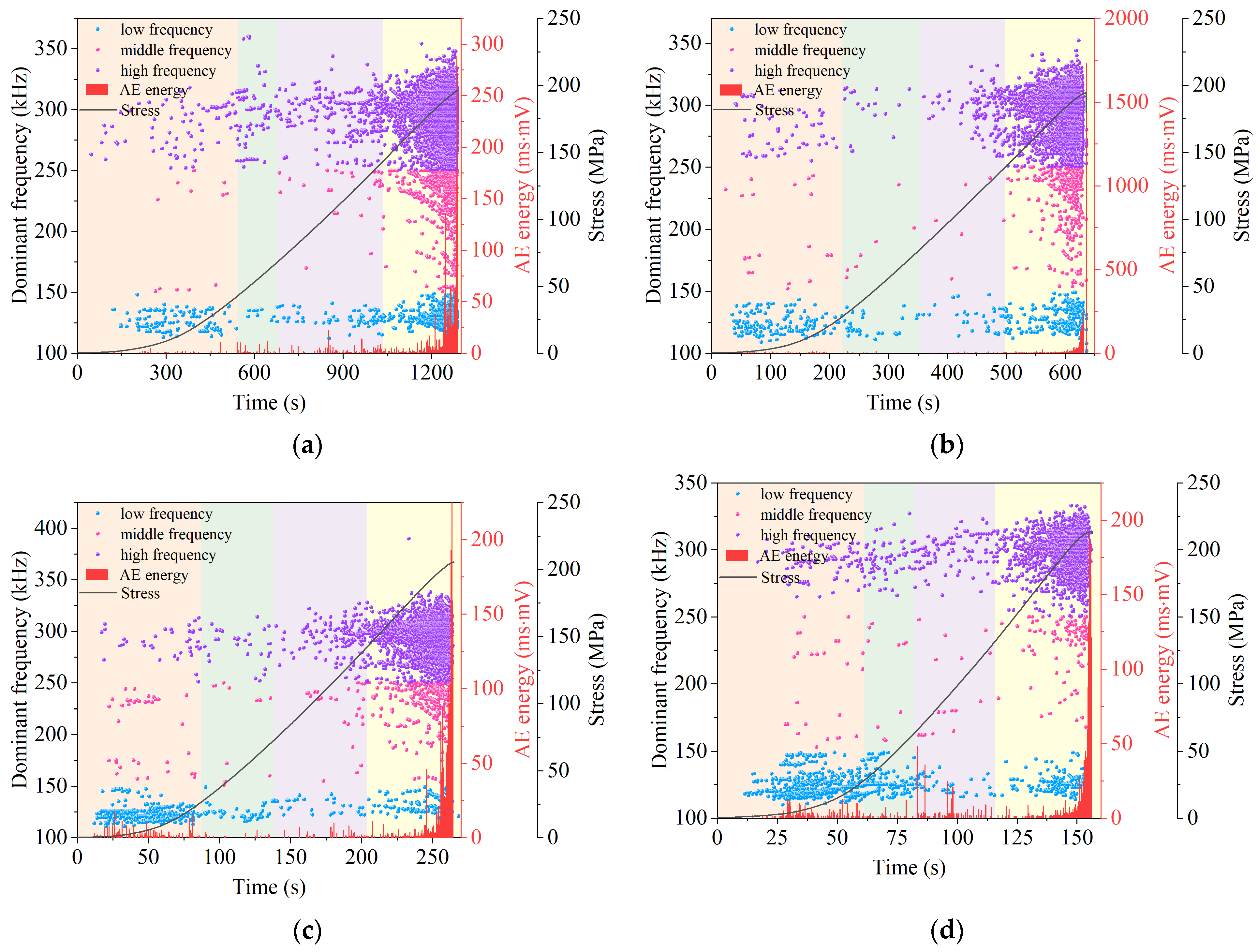 3.3.4. AE Dominant Frequency Distribution and Energy Characteristics
