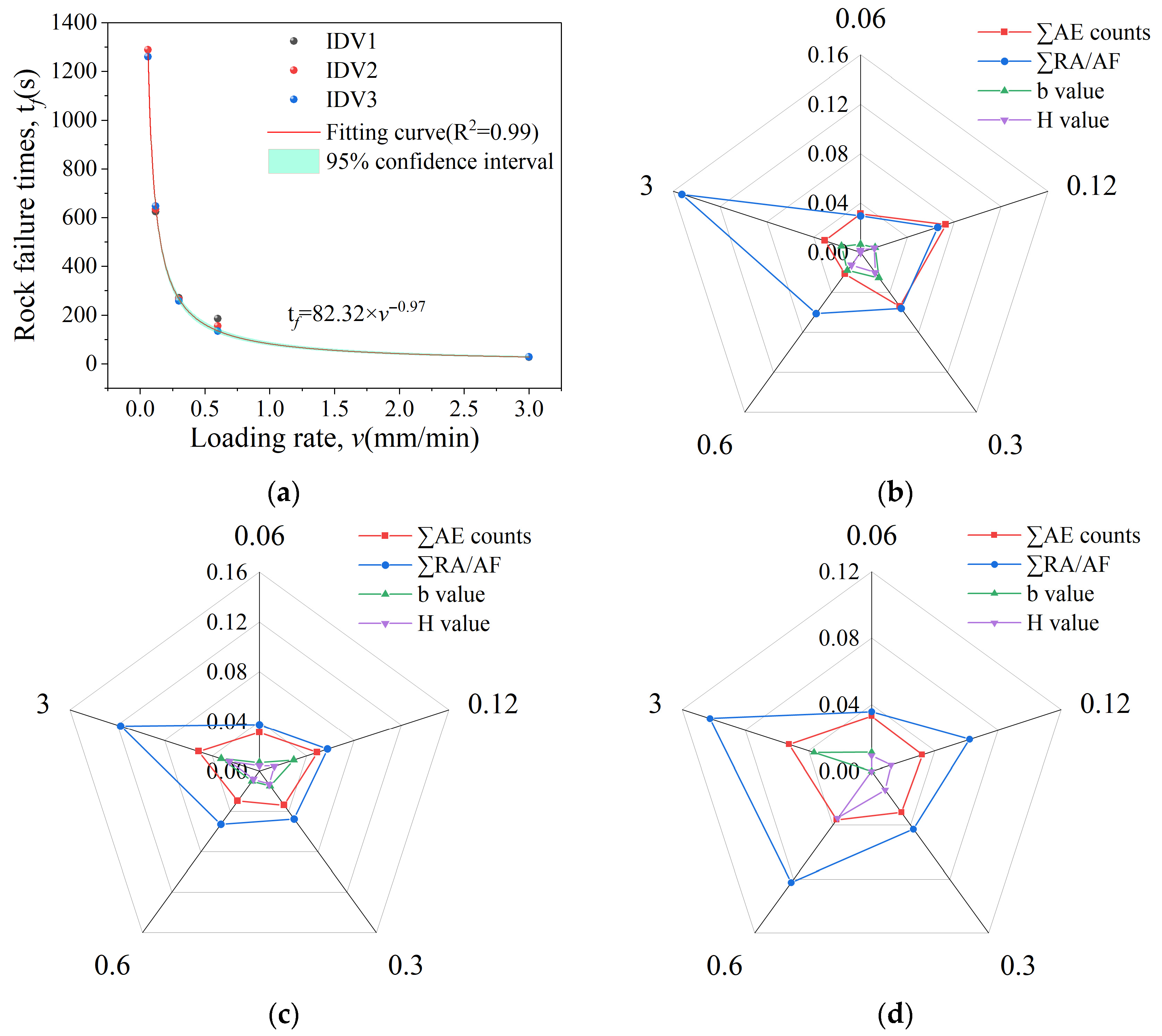 - Granite’s failure time in uniaxial compression tests follows an inverse exponential trend with respect to the applied loading rate (tf = 82.32 × v−0.97). A higher loading rate leads to faster failure, and the failure time gradually approaches a stable value. Initial damage exerts minimal effect on the failure time. The sensitivity of precursor responses differs among AE parameters, following the order of cumulative RA/AF value > cumulative AE counts > b-value > entropy.