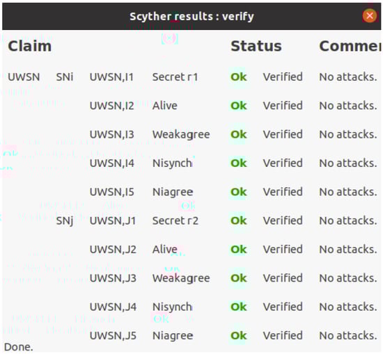 Scyther [17,18] is an automated verification tool to analyze and verify the security of authentication protocols, and detects various attack scenarios. Scyther tool verifies security properties through multiple independent executions for security protocols, and is widely used for research purposes due to its intuitive interface. Scyther tool can be executed on various operating systems such as Windows, Linux, and Mac OS X. The security protocols are described in a dedicated description language, “Security Protocol Description Language (SPDL)”. Then, Scyther tool automatically performs verification and outputs analysis results based on claim events, such as “Aliveness”, “Weak Agreement”, “Non-injective Agreement”, and “Non-injective Synchronization”. If “OK” and “No attacks” are displayed for each claim, it means that the corresponding security property is satisfied. It should be noted that Scyther performs verification under the Dolev–Yao adversary model and does not simulate physical-layer channel noise (e.g., bit errors due to attenuation or multipath). Therefore, our Scyther-based verification focuses on protocol-level properties (e.g., authentication and session key secrecy) against an active attacker who can eavesdrop, replay, and modify messages. In the SPDL model, we represent the main protocol participants as roles (e.g., SN and BS) and verify the security claims for representative protocol sessions. Regarding denial-of-service (DoS), Scyther is not intended to model resource-exhaustion effects; thus, DoS resilience is discussed based on the protocol design choices (lightweight operations and early verification checks) and the comparative overhead analysis in the performance section. Figure 5 shows the Scyther verification results for the proposed protocol.