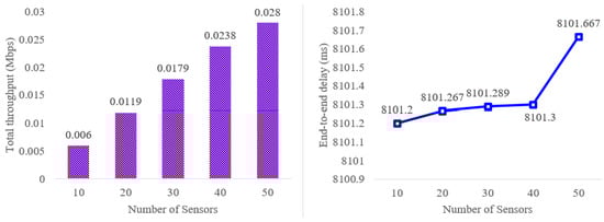 When the simulation is end, we can calculate throughput (, : Throughput, : Received total packets, : Packet size, : Total time) and end-to-end delay (, : End-to-end delay, : total message packets in authentication, : Received time, : Sent time) using flowmonitor files. The simulation results using NS-3 are shown in Figure 8. Based on the result, we can demonstrate that the throughput and end-to-end delay are increased as the number of sensors increases.