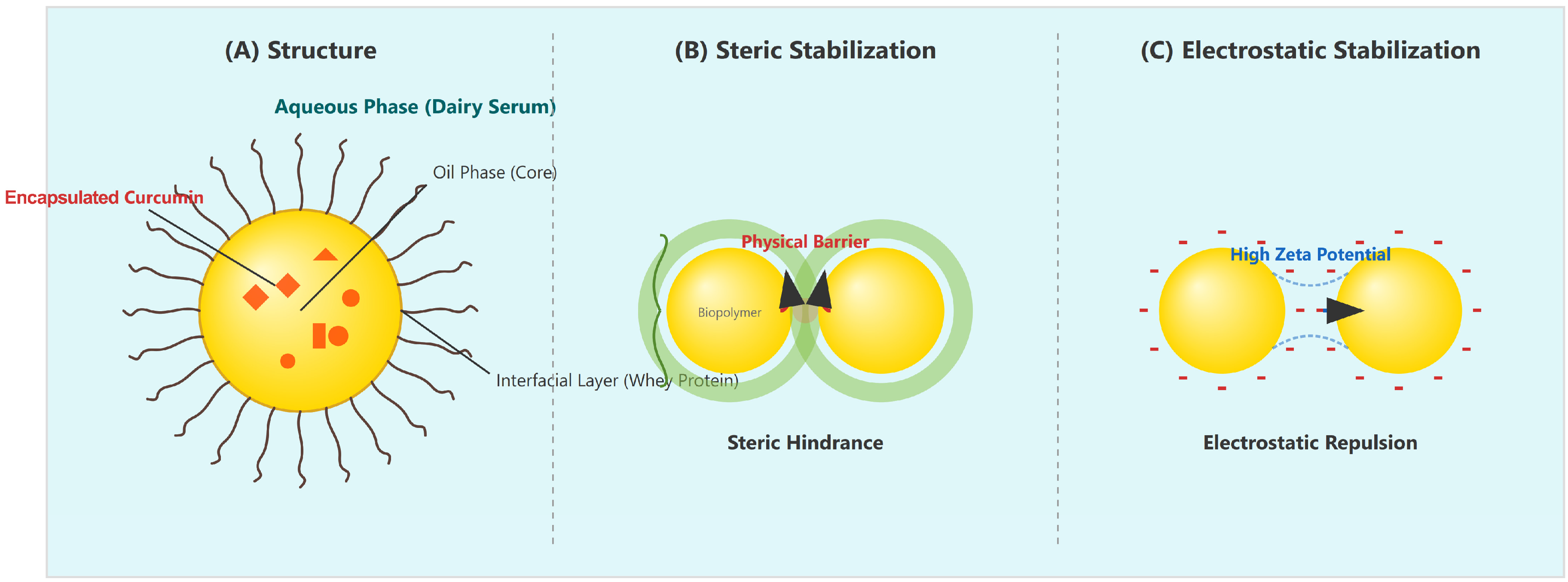 | Biopolymers (proteins) | Whey protein isolate (WPI), caseins, sodium caseinate | Create thick viscoelastic interfacial layers, providing steric stabilization | Highly compatible with dairy matrices; strong long-term stability; clean-label | Heat sensitivity; possible pH- or ion-dependent interactions |