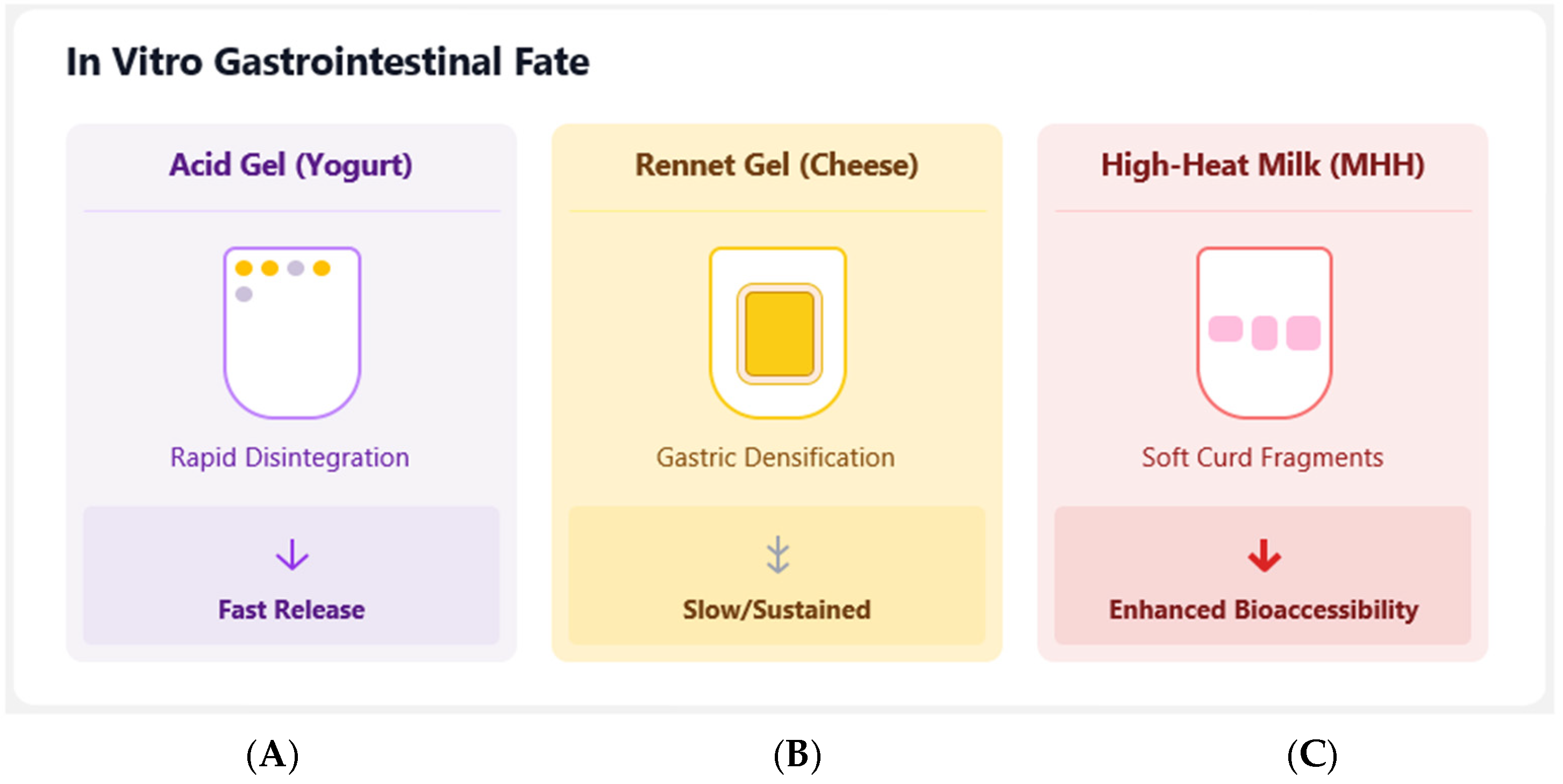 | Yogurt-Like (Acid Gel) | _____ | High (85–91%), with fast-release kinetics. | Matrix structure: Rapid protein disintegration in the stomach leads to fast gastric emptying. |