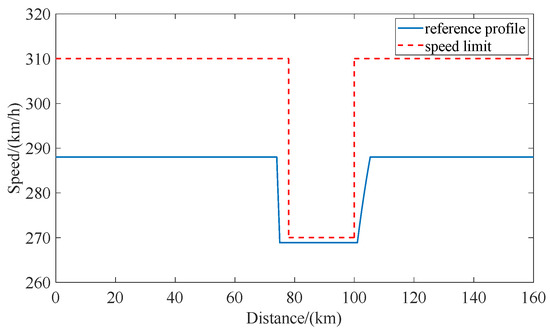 In this section, several numerical experiments are conducted for tracking control in the VCTS subject to multiple external disturbances to illustrate the performance of the proposed FTESO-NTSM control algorithm. In the simulation, we take 4 CRH-3 trains as a train convoy, which consists of 1 leading train and 3 following trains. The parameters of a CRH-3 train are shown in Table 1. To ensure convenience during the simulating process, a simulation environment was constructed to represent a cruising scenario under temporary speed restriction. To emulate diverse tracking behaviors in the train platoon, the initial conditions of each train, including their speed and tracking distance, were configured with different values. The operation conditions of HSR in the experiment are given as follows: (1) The total length of cruising distance is set as 160 km; (2) the maximum speed limit is 300 km/h; (3) the reference cruising speed is 288 km/h; and (4) a temporary speed restriction of 270 km/h is applied between 80 km and 100 km to emulate real-world operational interventions, such as maintenance zones or adverse weather conditions. The speed limit of the line is 310 km/h, as shown in Figure 4. The experiments are operated on a PC with a 1.6 GHz processor and 16 GB memory by Matlab2023b.