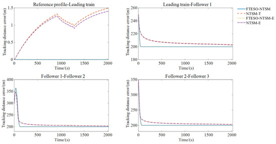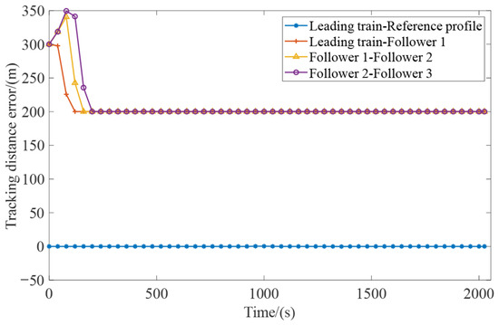 Figure 6 and Figure 7 illustrate the tracking speed error and tracking distance error profiles of adjacent trains in the VCTS. Since the reference profile does not account for external disturbances, the leading train exhibits fluctuation phenomenon during reference tracking. The tracking speed error varies within the range of [−0.049 km/h, 0.061 km/h] and the tracking distance is within the range of [7.7 × 10−4 m, 2.6 × 10−3 m] for most of the simulation duration. However, due to the temporary speed restriction, the maximum tracking distance error of the leading train increases to −0.28 m and 0.47 m. During the initial phase, followers 1, 2, and 3 operate at a speed-adjustment stage to achieve virtual coupling. Their acceleration initiation is sequentially delayed relative to their preceding trains, which can be attributed to their lower initial speeds and the dependency of their control strategies on the state of the preceding train. Ultimately, the three followers achieve coordinated operation by reaching both the target speed and the desired safe spacing at 69 s, 131 s, and 162 s, respectively.