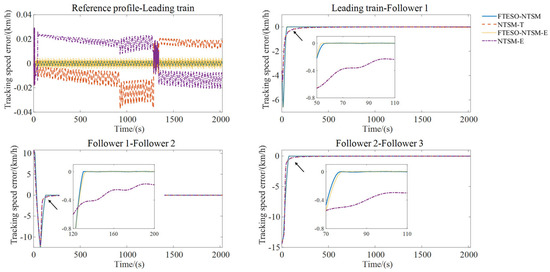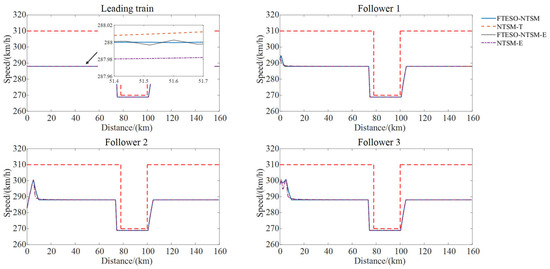 Comparison of speed profiles in the train convoy by FTESO-NTSM, NTSM-T, FTESO-NTSM-E, and NTSM-E.