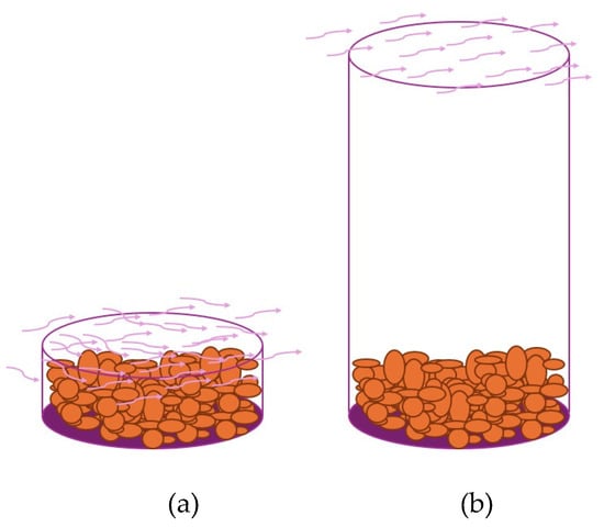 is the absolute humidity of the air circulating through the chamber, passing over the top of the opening of the tubes, or over the top of the biomass placed in trays. This humidity can be calculated using Equation (12), where is the vapor pressure of the air in pascals.