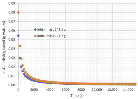 It is demonstrated that the instantaneous drying rate (g of water dried per second) is not constant over time but varies. Figure 7 shows the variation in drying rate over time in the experiments taken as an example. Given this variation in speed, several criteria can be used to define an average drying rate for the experiment. On one hand, many authors calculate the average drying rate as the average of the instantaneous drying rates (average criterion); other authors take the average drying rate as the difference between the initial and final mass, divided by the process time (mass loss criterion); while others take the slope of the linear trend curve as the average drying rate (slope criterion), as is shown in Figure 6 with 0.0021 g dried water/s and 0.0016 g dried water/s.