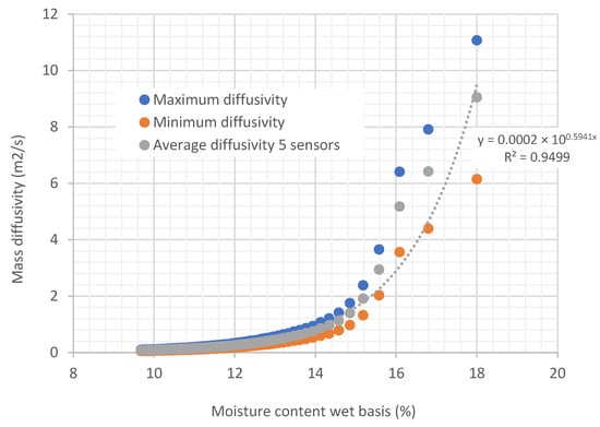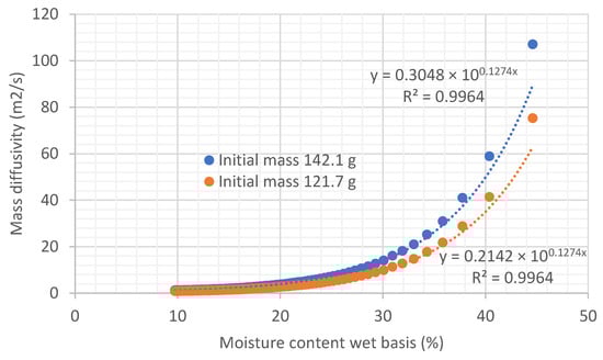 If diffusivity at the solid-air interface of the biomass is calculated using Equation (4), derived from Fick’s Law, it can be observed that the diffusivity of water is also not constant throughout the drying process but depends on the moisture content. Figure 9 shows this variation in diffusivity in the experiments taken as examples. It is shown that the variation in diffusivity with moisture follows an exponential equation.