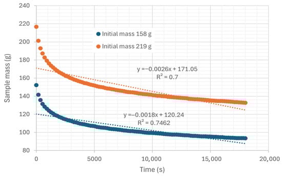 For the evaluation of convection processes, the samples are placed in trays on load cells. The air current directly impacts the biomass surface, allowing the removal of water particles. Table 3 shows four experiments for calculating the transfer coefficient by convection, two performed at room temperature and two performed with hot air. Figure 13 shows the mass variation in two examples of convective drying performed in a tray with hot air. The initial wet mass of one sample was 219 g, while the other was 158 g. In these experiments, the air temperature and relative humidity were 45.35 °C and 22.38%, respectively. The curves are practically parallel if the difference between them corresponds to the difference in mass of the sample.