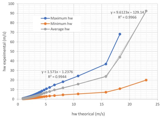 Figure 17 and Figure 18 show example curves comparing the determinations obtained with the prototype and the calculation of by the Sherwood method. The air circulation speed for all the experiments shown is 0.254 m/s. It can be seen that both the theoretical and experimental change throughout the evaluation process. In the experiments carried out (Figure 17 and Figure 18), if we consider the average curve of all the sensors, the mass transfer coefficient by convection differs between 2.54% and 56% from that estimated by the theoretical model.