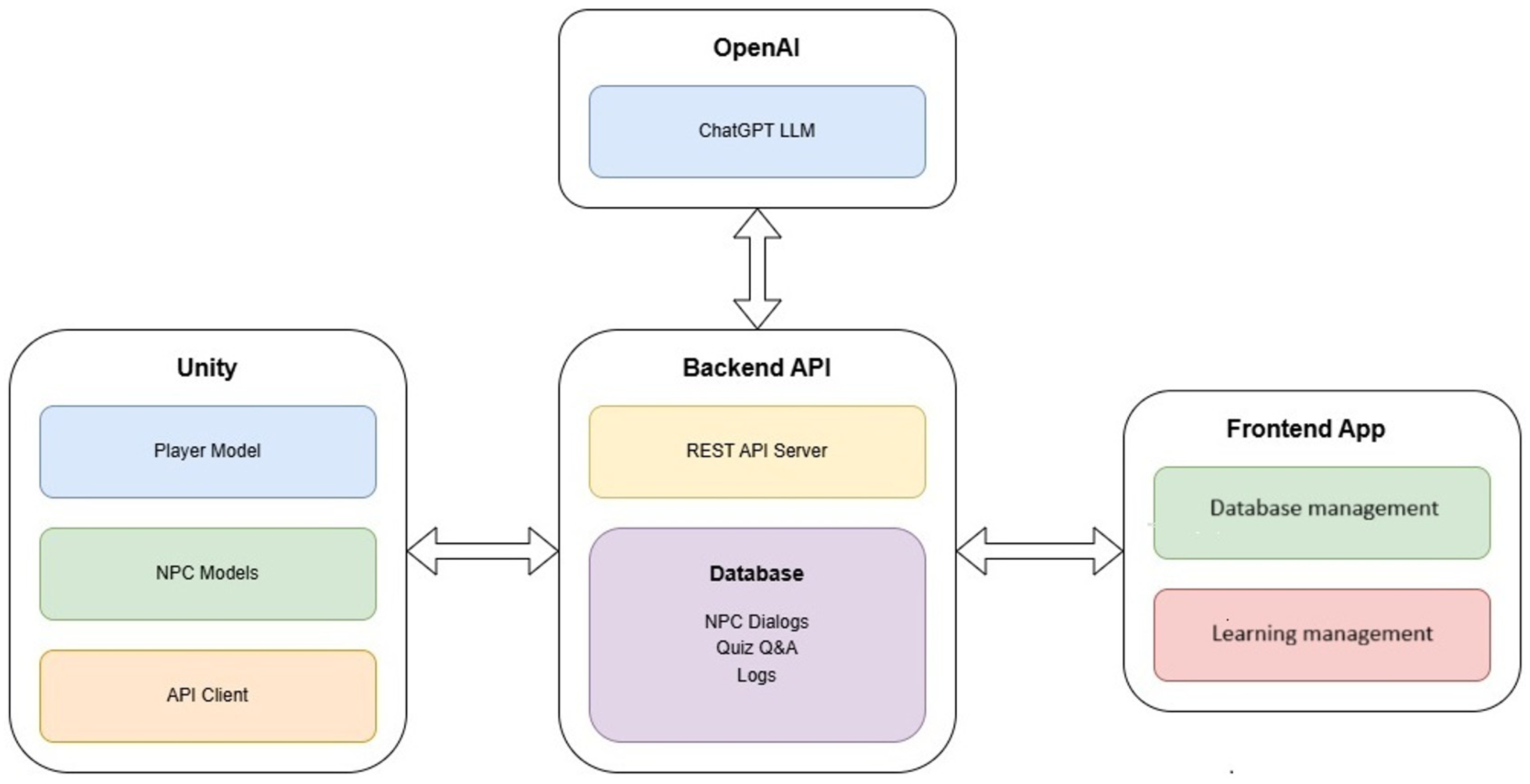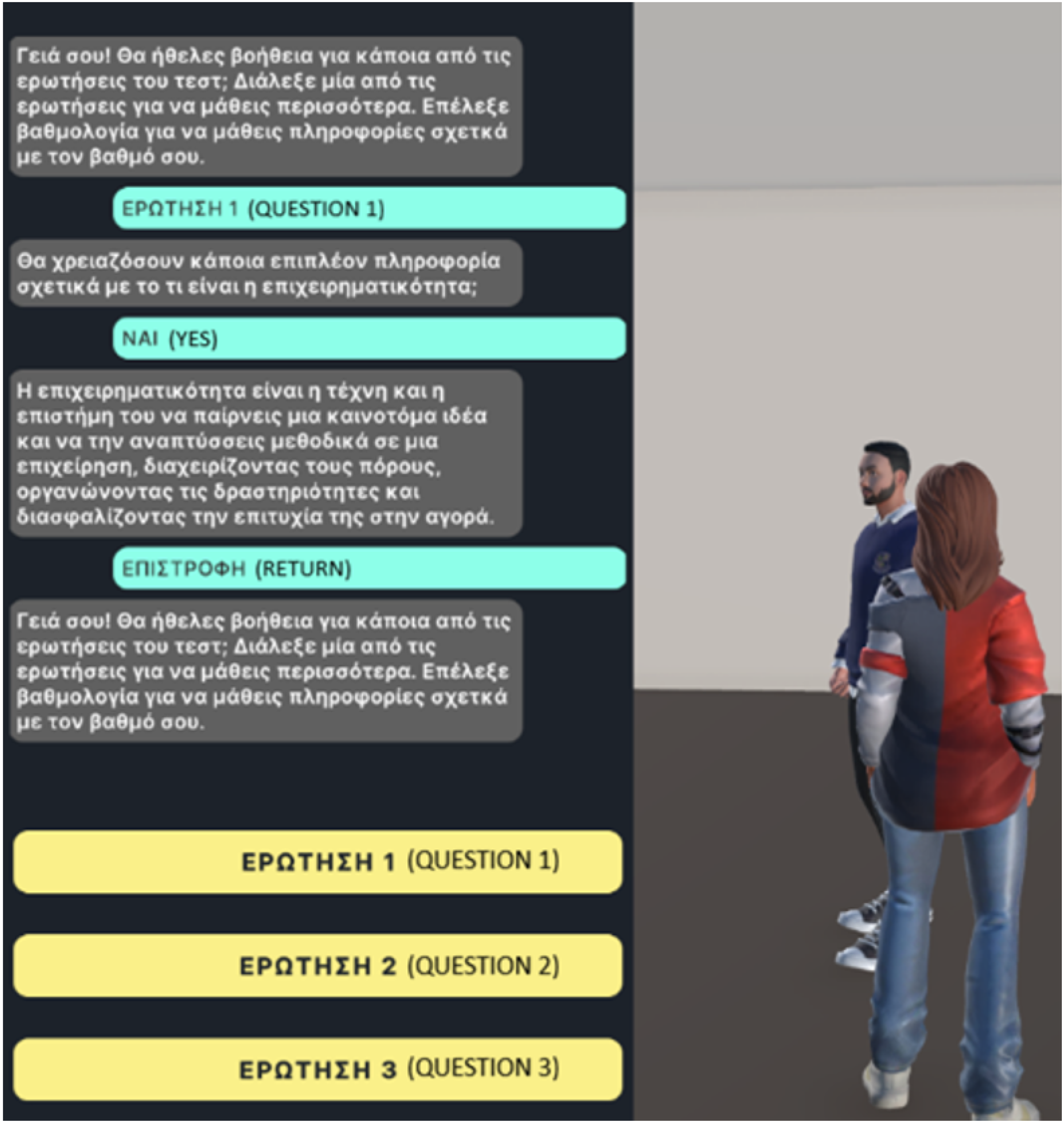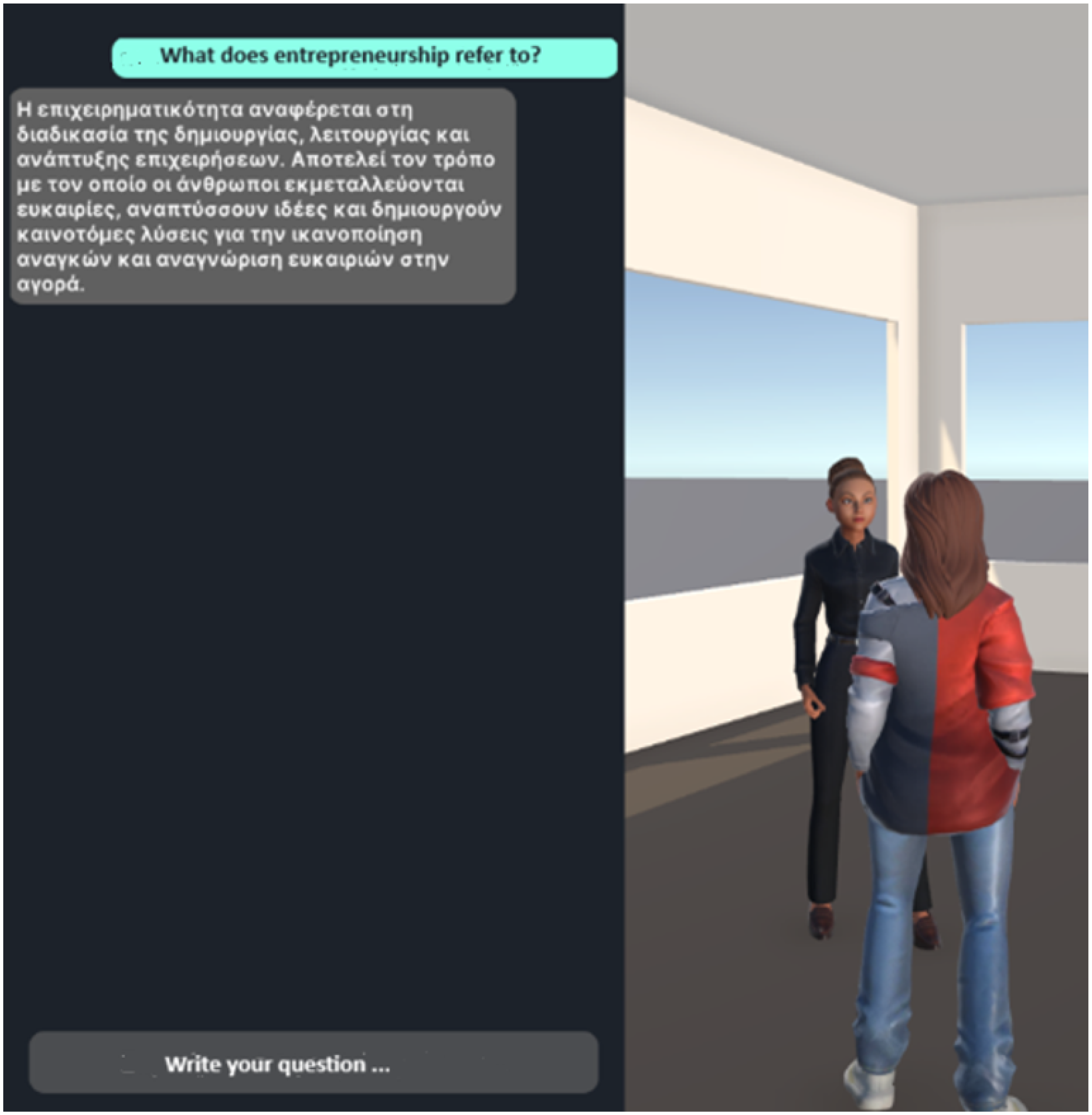 - Barmpari, A.; Voyiatzaki, E.; Hatzilygeroudis, I. An Educational Virtual World System with Gamification Features and LLM Guided NPCs. In Generative Systems and Intelligent Tutoring Systems (ITS 2025); Grafand, S., Markos, A., Eds.; LNCS 15773; Springer Nature: Cham, Switzerland, 2025; pp. 213–223. [Google Scholar] [CrossRef]