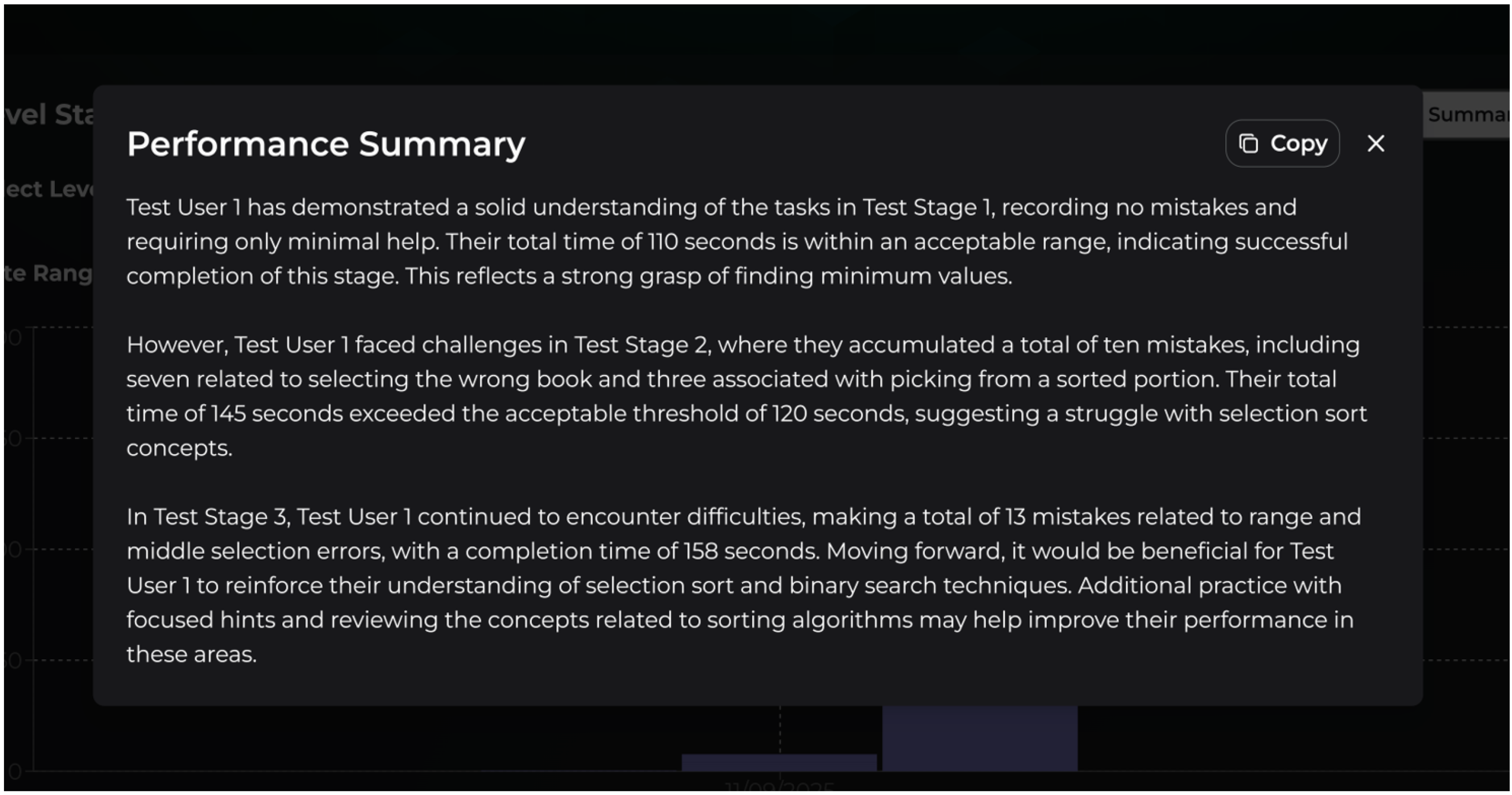 - a personalized message automatically generated with the support of the Gemini LLM, which described the detected issue (e.g., if a learner appeared to be “stuck” in a specific stage for an extended period);