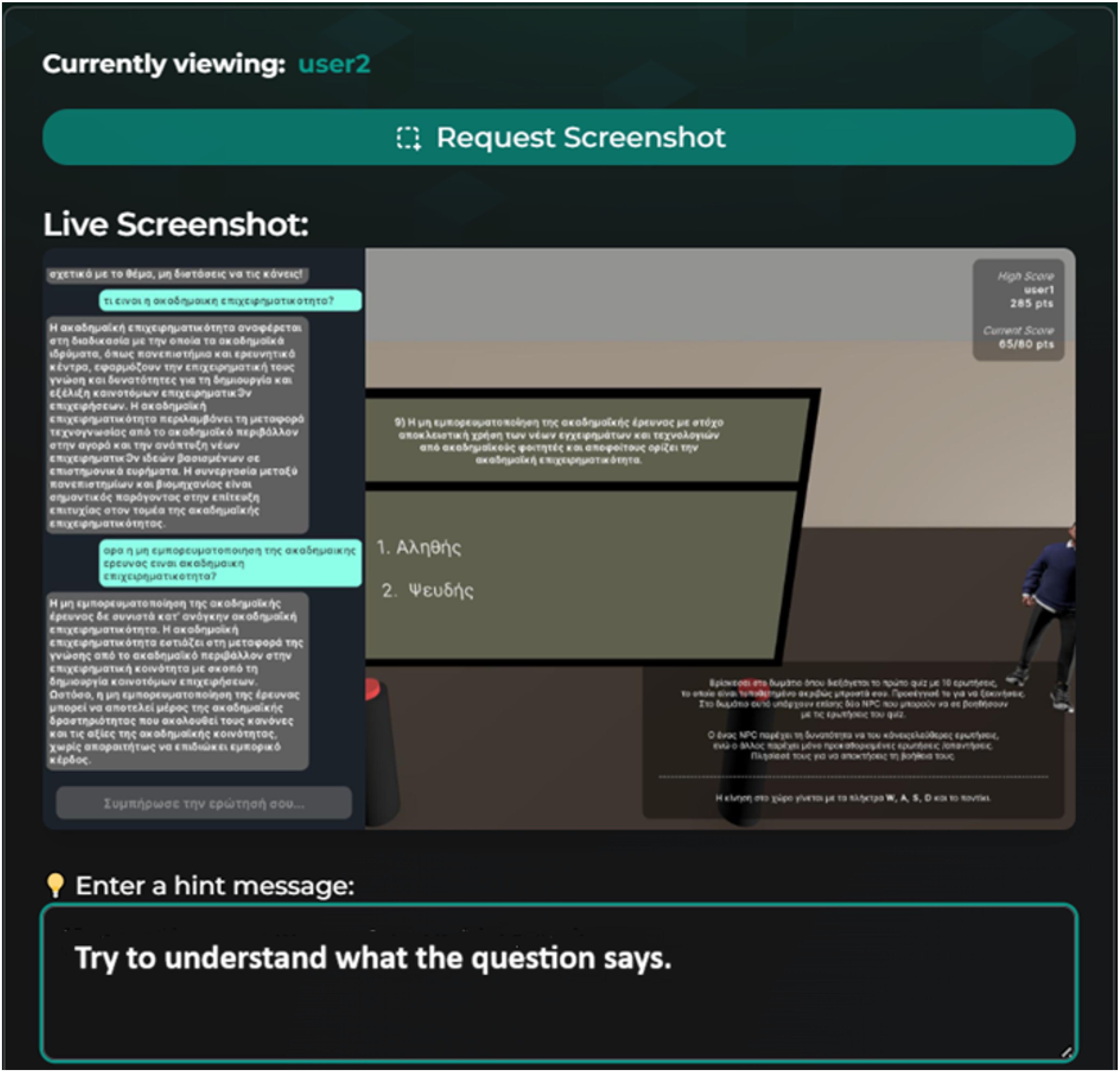 APA StyleBarmpari, A., Pavlopoulos, I., Voyiatzaki, E., & Hatzilygeroudis, I. (2026). A Virtual Tutoring System with Gamification, LLM-Guided NPCs, and Online Tutor Support. Applied Sciences, 16(2), 899. https://doi.org/10.3390/app16020899