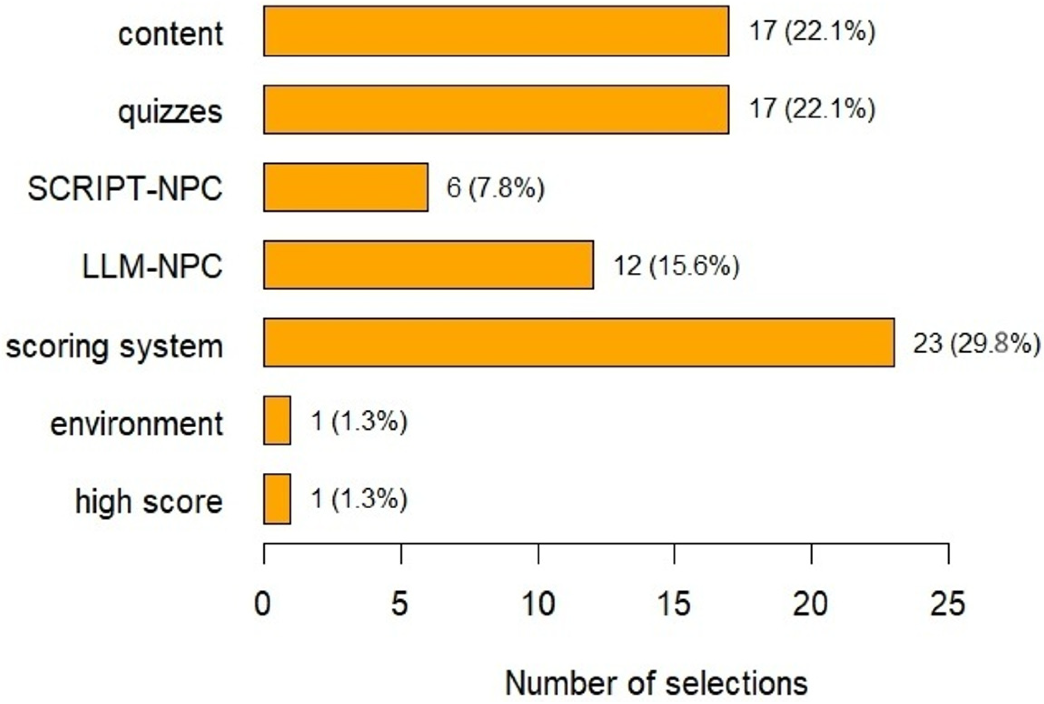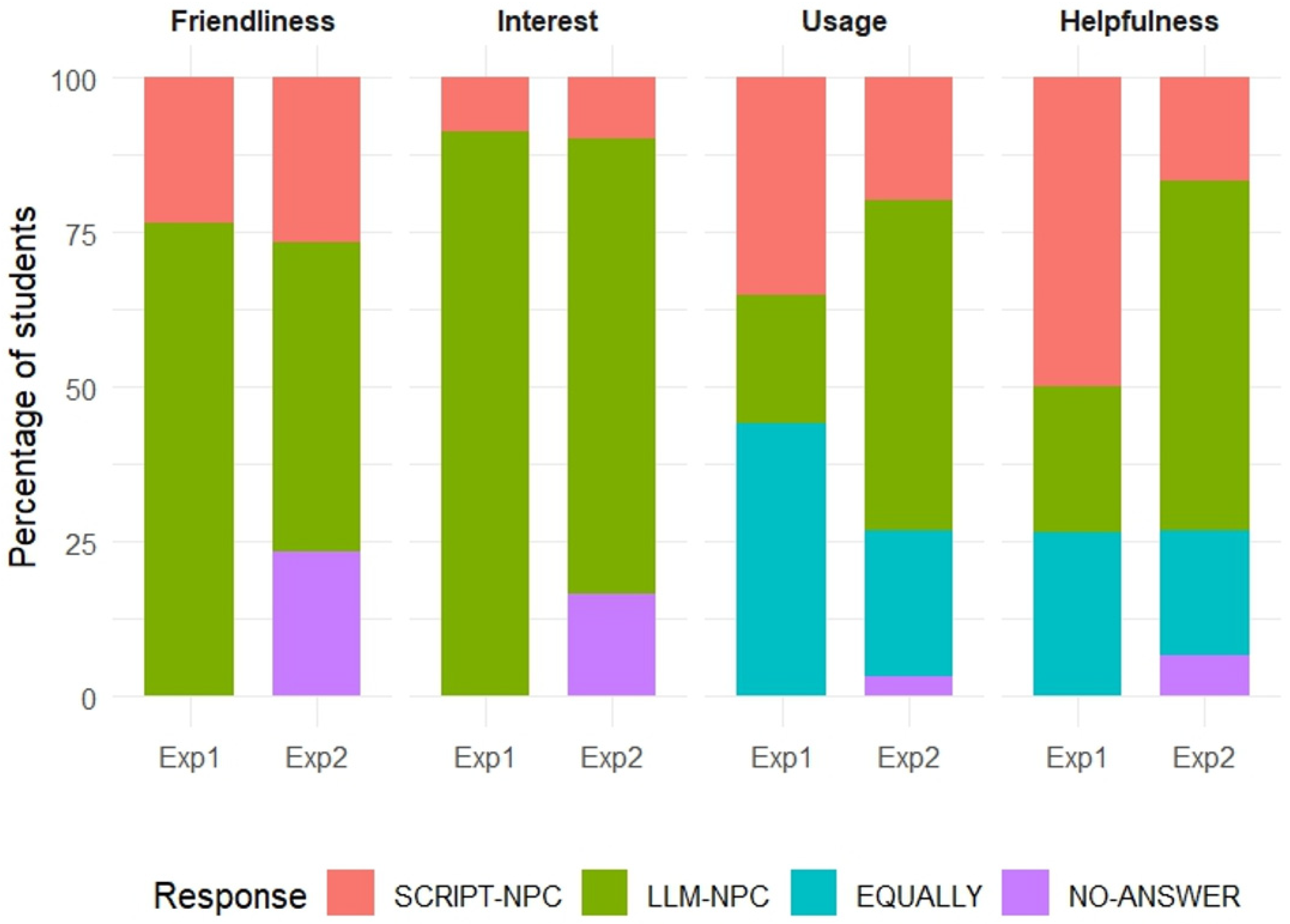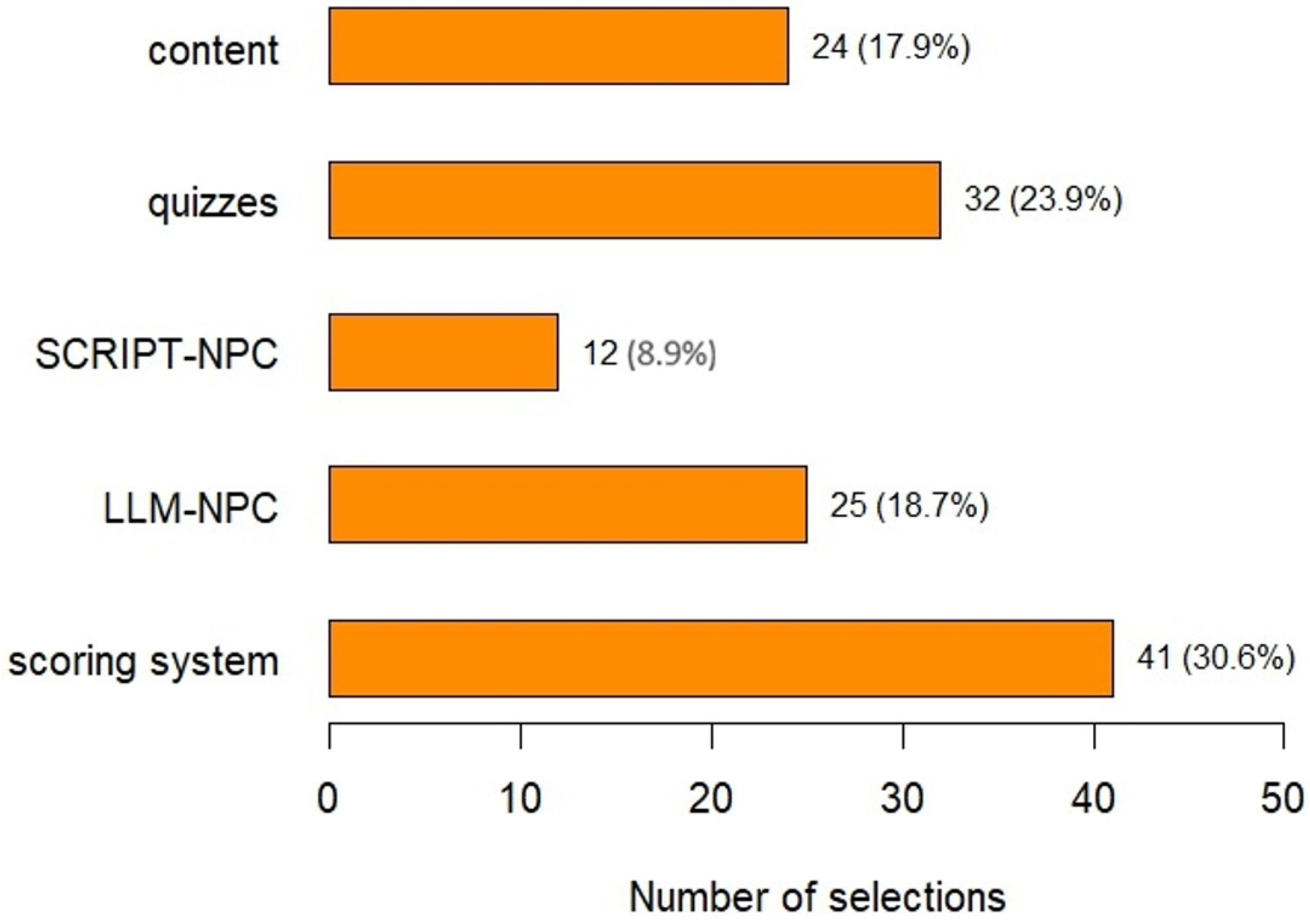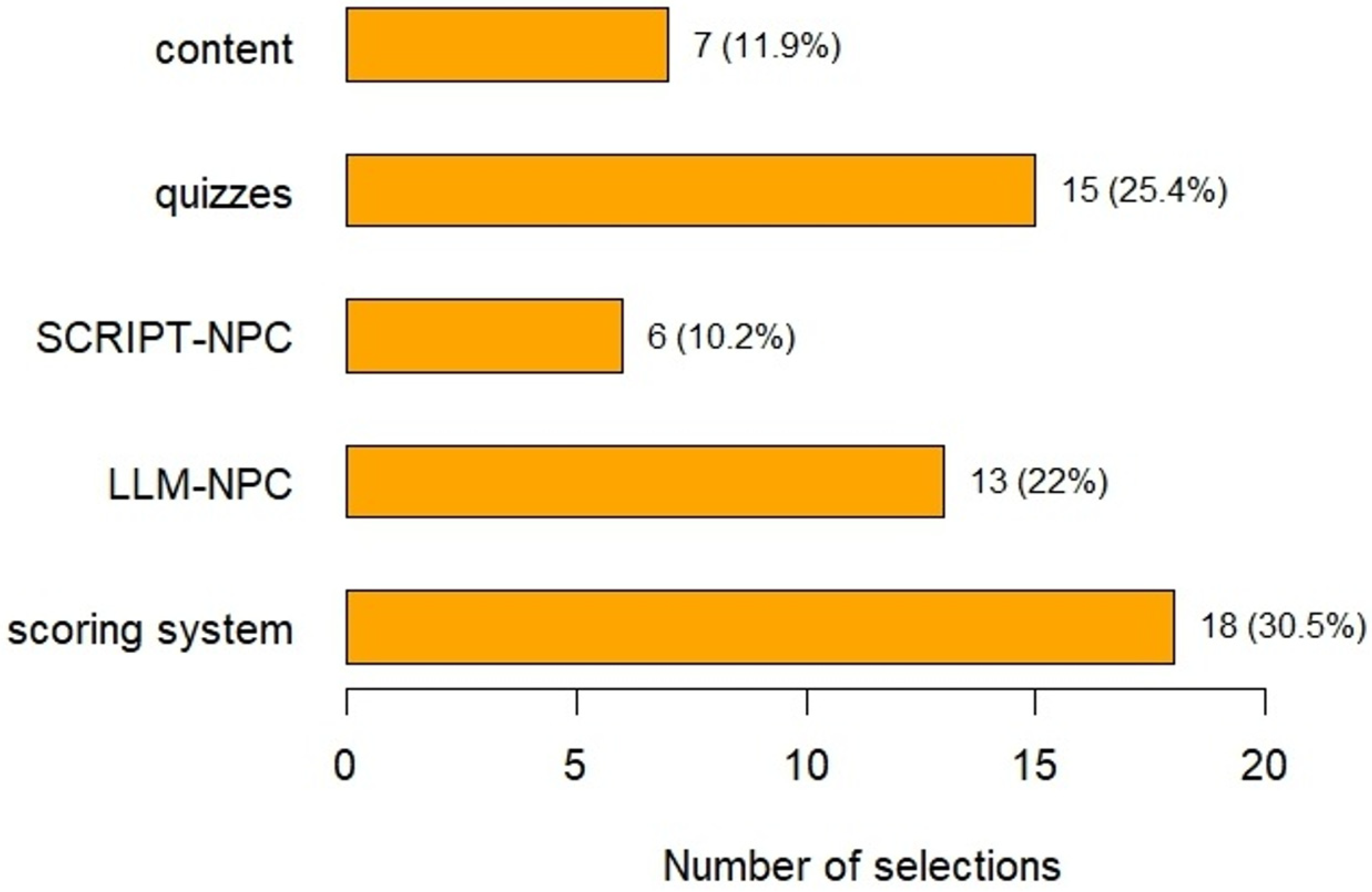 | Aspect | SCRIPT-NPC n (%) | LLM-NPC n (%) | No Answer n (%) | Equal n (%) | p Value |