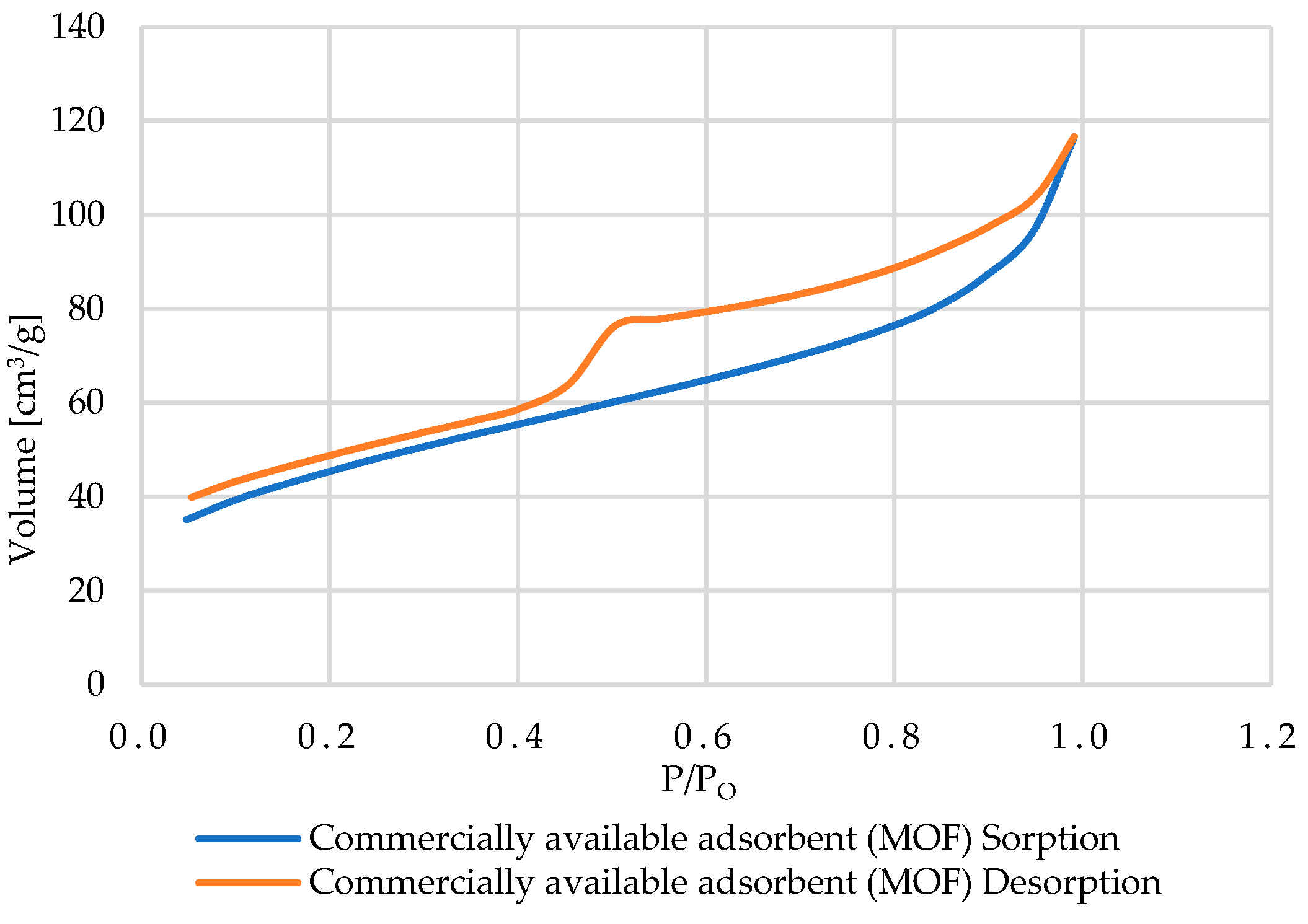 | Commercially available adsorbent (MOF) | 122.00 | 1.44 × 10−1 | 46.5/4.65 |