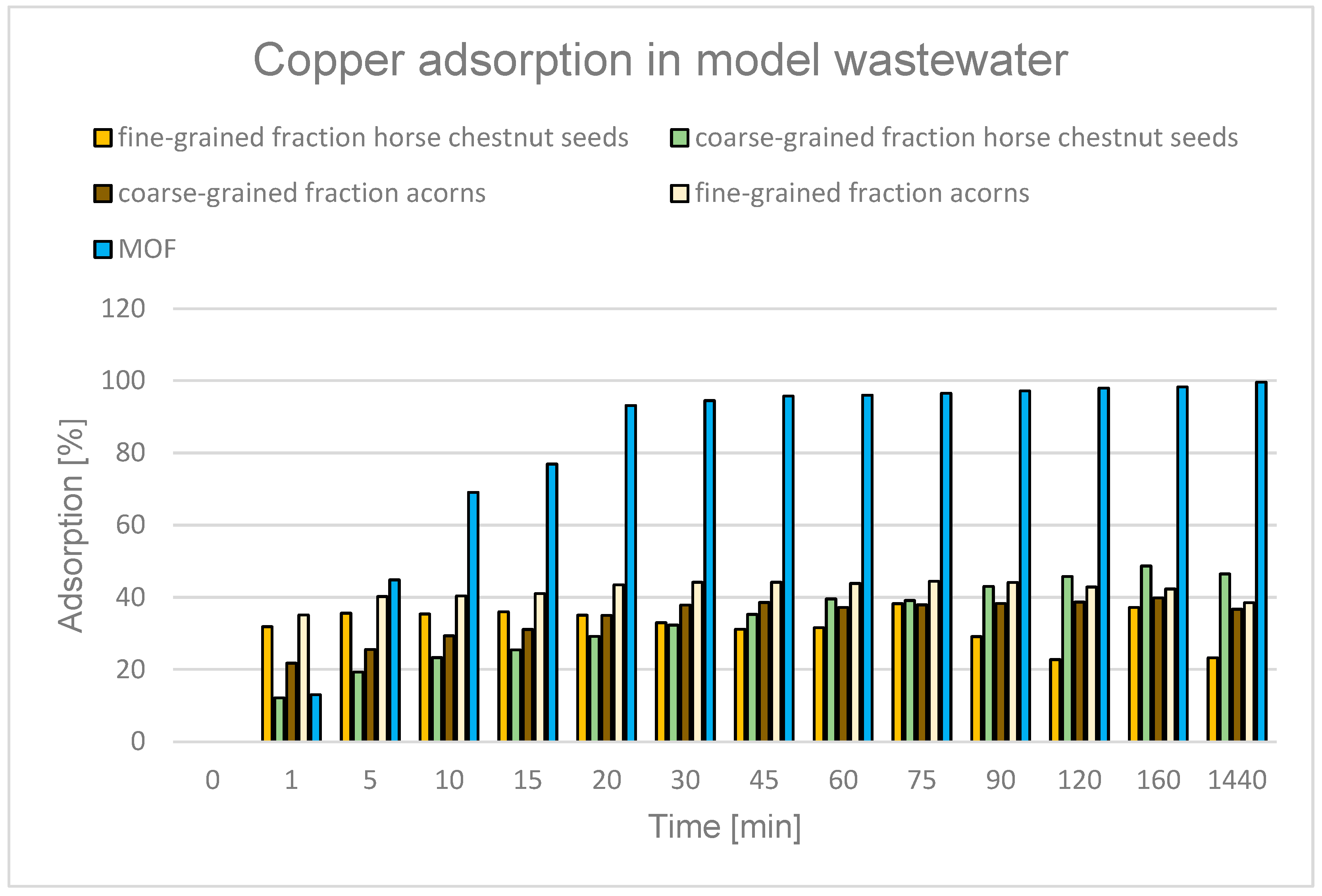 - Goyal, B.; Mehta, P.; Goyal, M.; Jadon, N. Chestnut Shell Nano-Adsorbent: Potential Bioadsorbent for the Removal of Heavy Metals from Industrial Wastewater. J. Indian Chem. Soc. 2016, 93, 531–537. [Google Scholar]