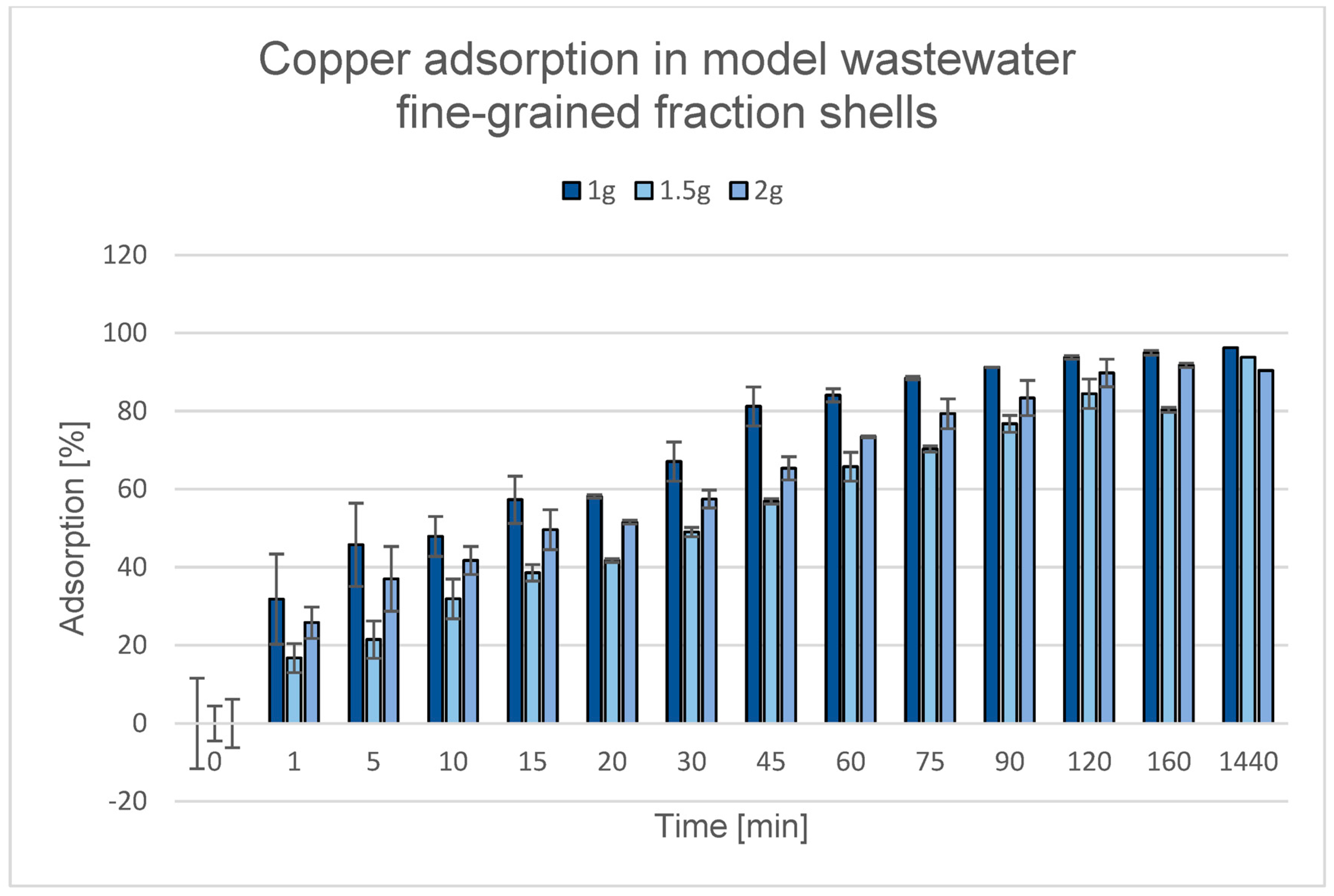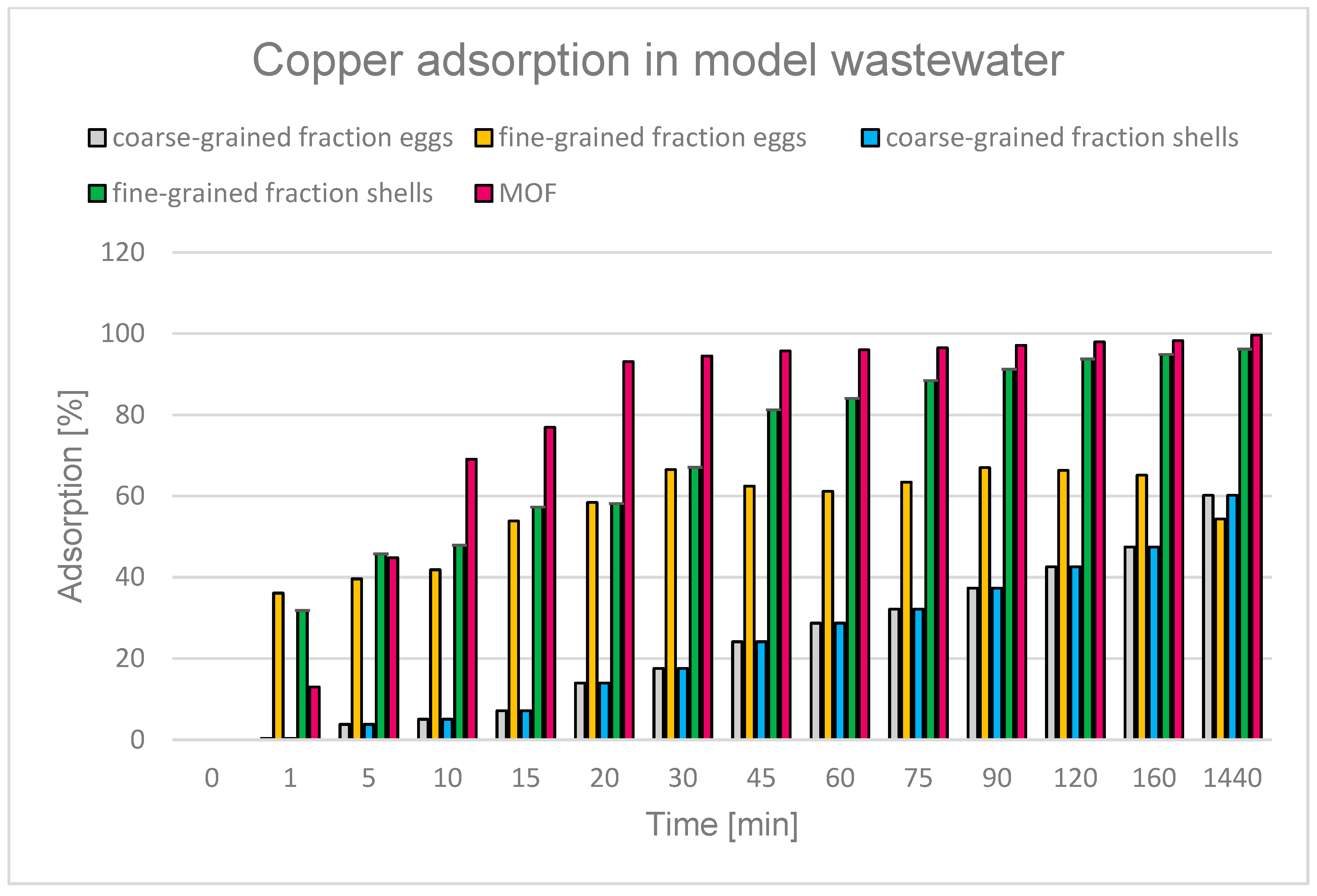 - Chou, M.-Y.; Lee, T.-A.; Lin, Y.-S.; Hsu, S.-Y.; Wang, M.-F.; Li, P.-H.; Huang, P.-H.; Lu, W.-C.; Ho, J.-H. On the Removal Efficiency of Copper Ions in Wastewater Using Calcined Waste Eggshells as Natural Adsorbents. Sci. Rep. 2023, 13, 437. [Google Scholar] [CrossRef]