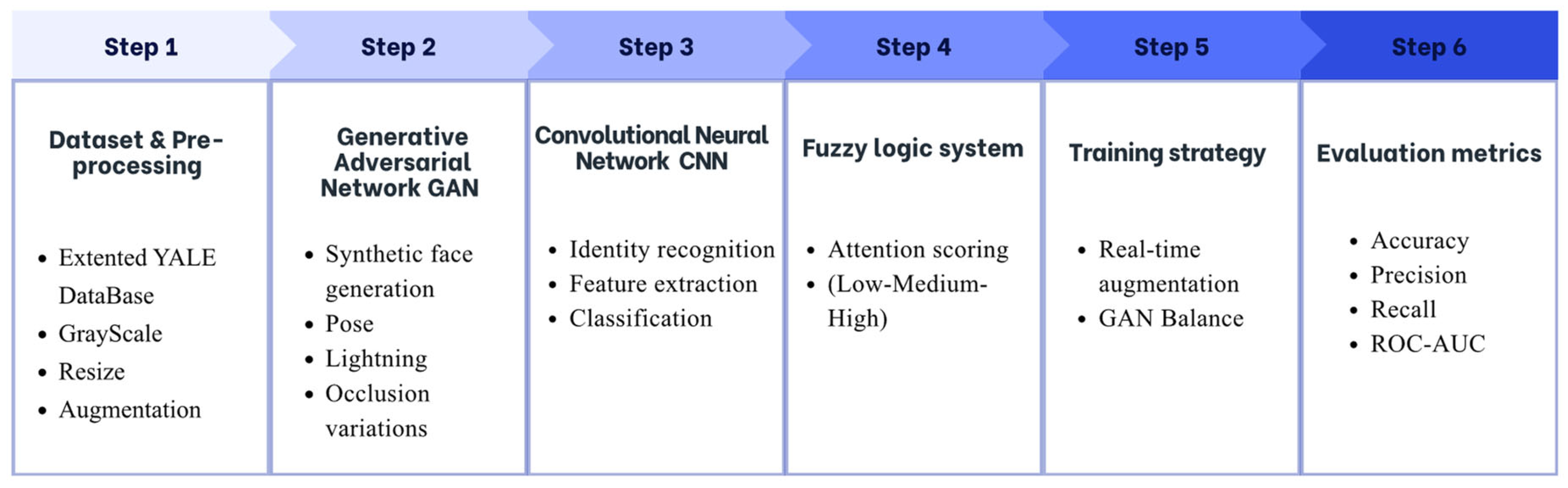This section presents the proposed sequential GAN–CNN–Fuzzy framework designed to achieve robust face recognition and interpretable attentiveness estimation in e-learning environments. The methodology integrates four major components: (1) dataset preparation and preprocessing, (2) GAN-based data augmentation, (3) CNN-based identity recognition, and (4) a fuzzy logic system to map CNN confidence scores into qualitative attentiveness levels. The overall workflow is illustrated in
