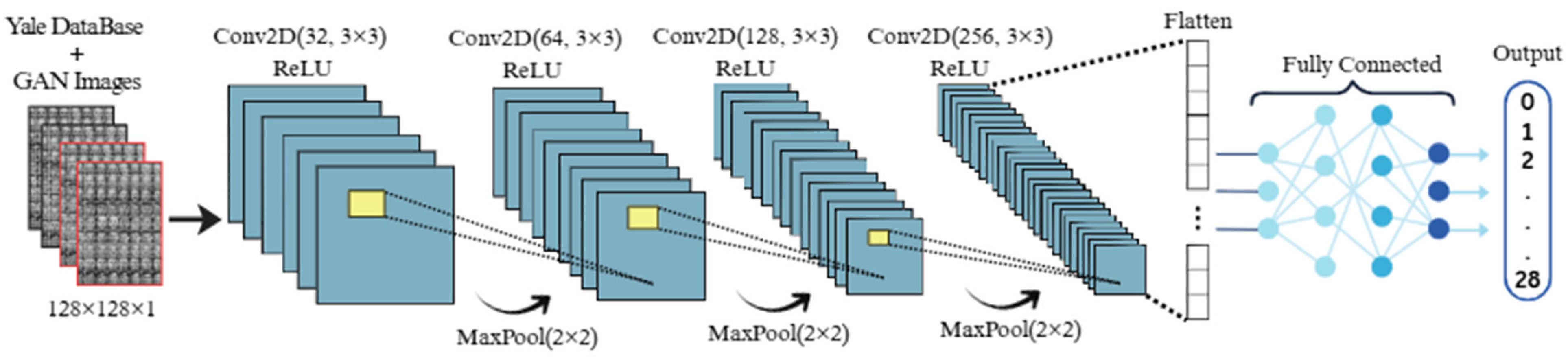 Because the generated images already match the required 128 × 128 normalized grayscale format, no additional preprocessing was necessary. Approximately 10% of the final training data consisted of GAN-generated samples. This controlled integration significantly increased dataset variability and contributed to the improved generalization performance of the CNN under challenging illumination and pose conditions.