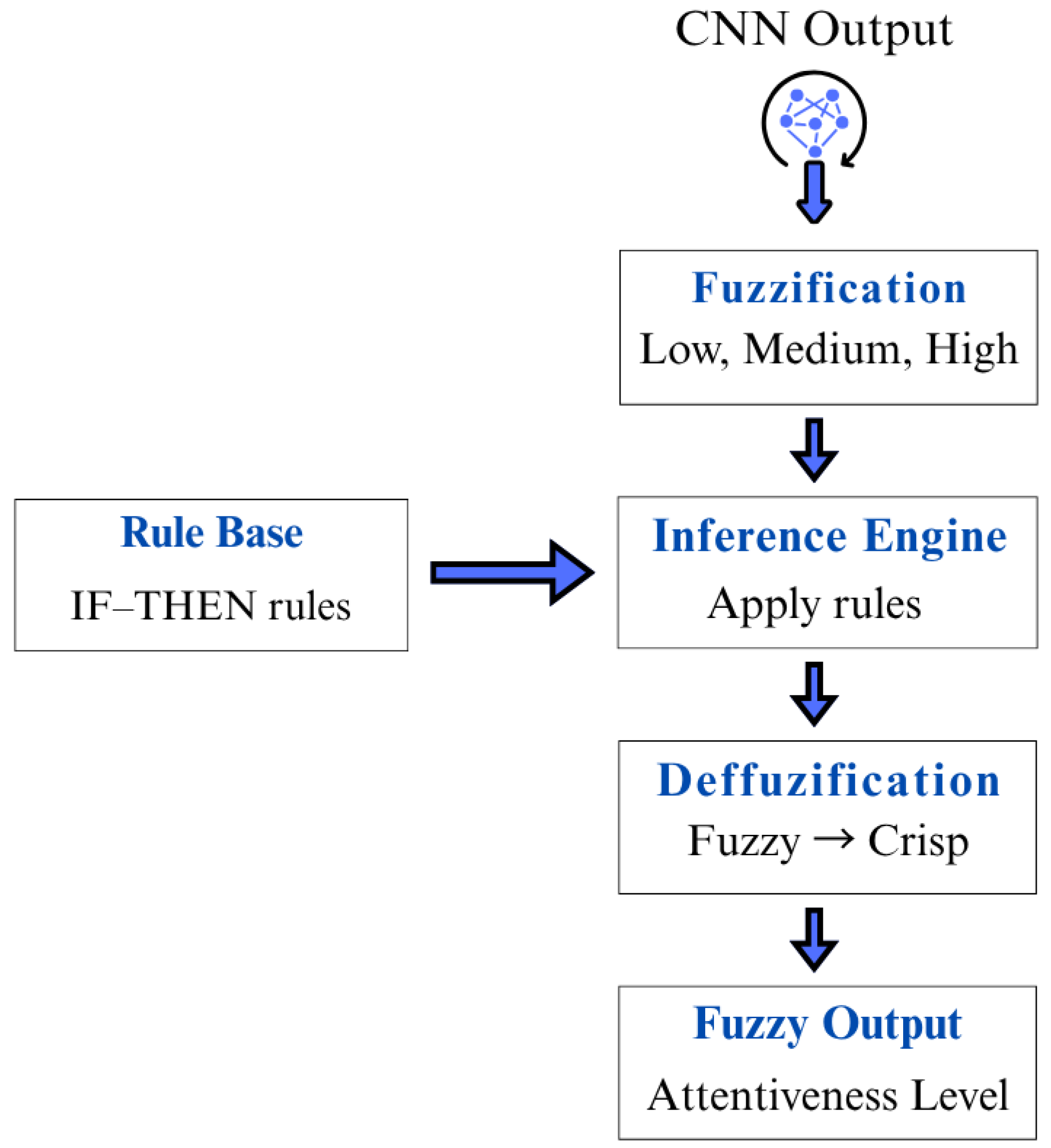 Beyond mapping numerical CNN confidence scores to discrete labels, the proposed framework integrates a Fuzzy Inference System (FIS) to enhance interpretability and robustness. In real online learning environments, CNN outputs are often affected by noise caused by pose variation, illumination changes, partial occlusions, and subtle facial expressions. The FIS employs overlapping triangular membership functions to model low, medium, and high concentration levels, enabling smooth transitions between categories and avoiding abrupt misclassifications near decision boundaries. Empirically determined thresholds (0.60 and 0.85), derived from observed CNN confidence distributions across multiple subjects and sessions, reflect natural confidence clustering. Compared to simple threshold-based mappings, the FIS better handles uncertainty and provides more human-interpretable attentiveness assessments, justifying its inclusion in the proposed sequential framework.
