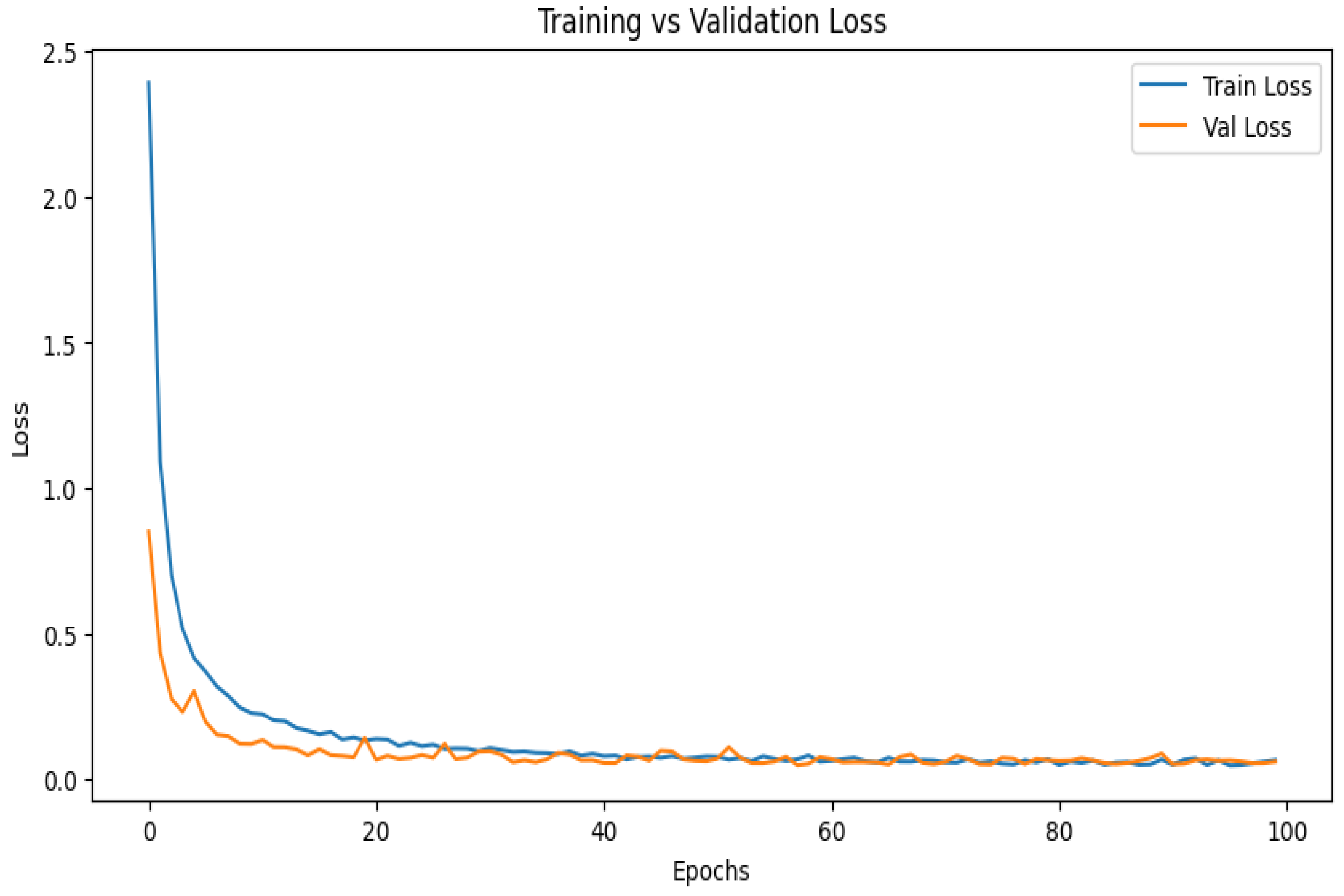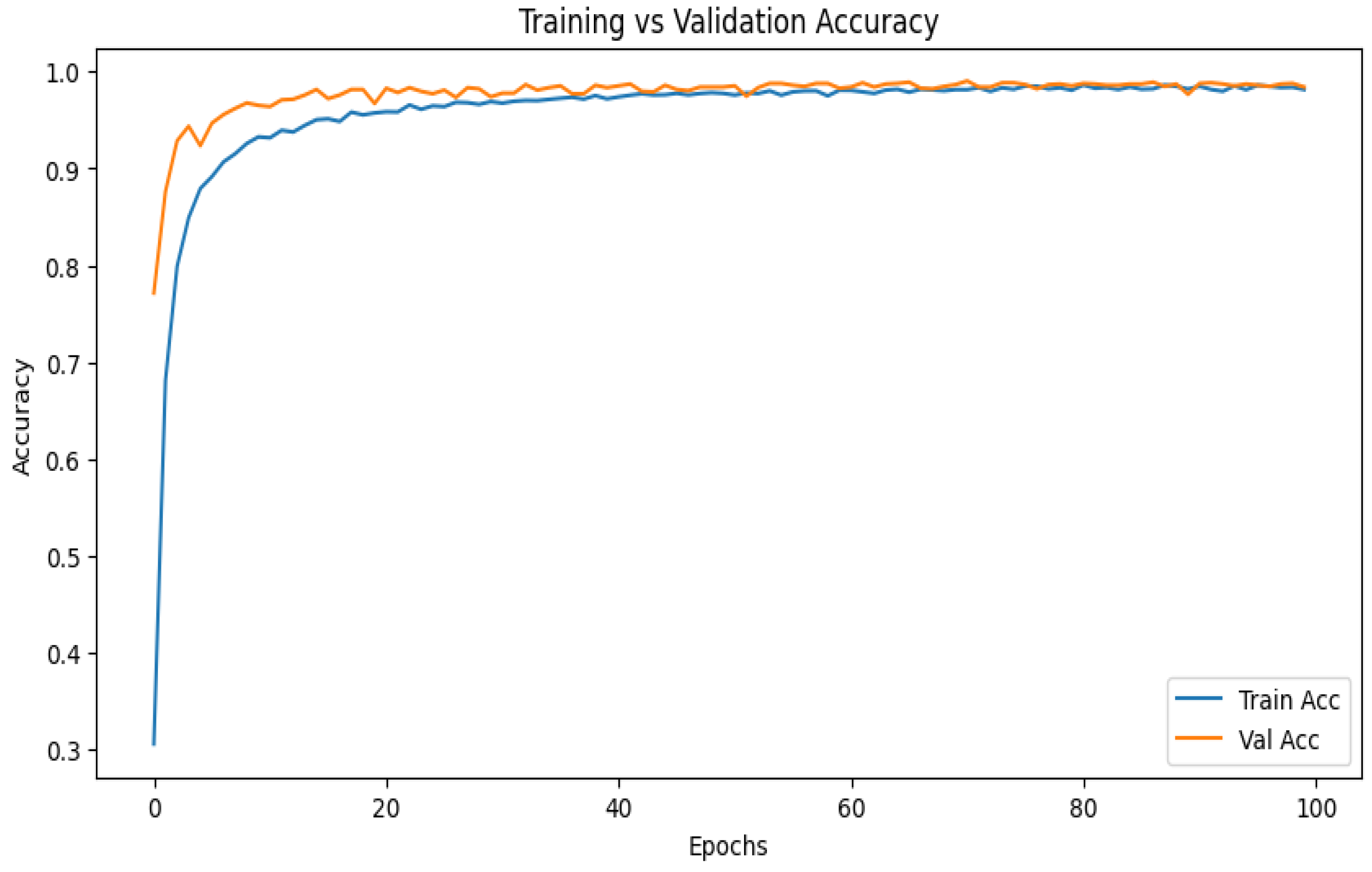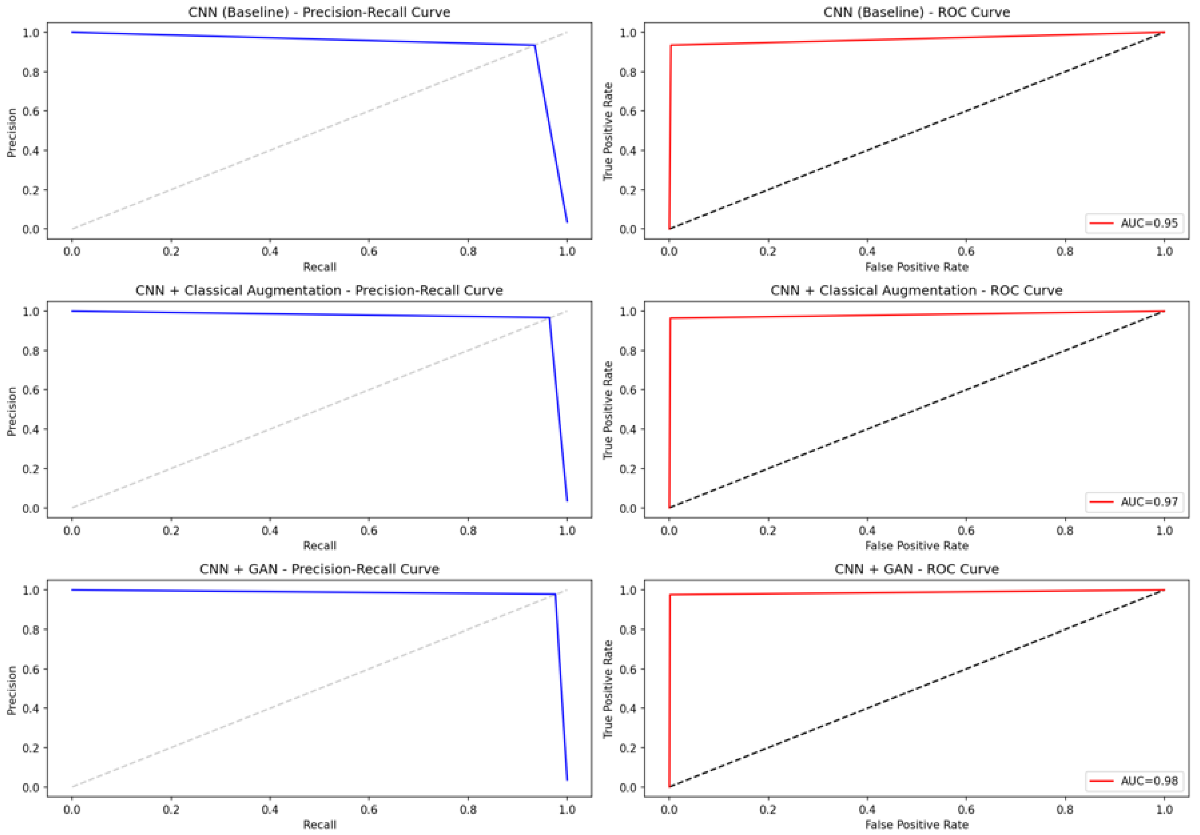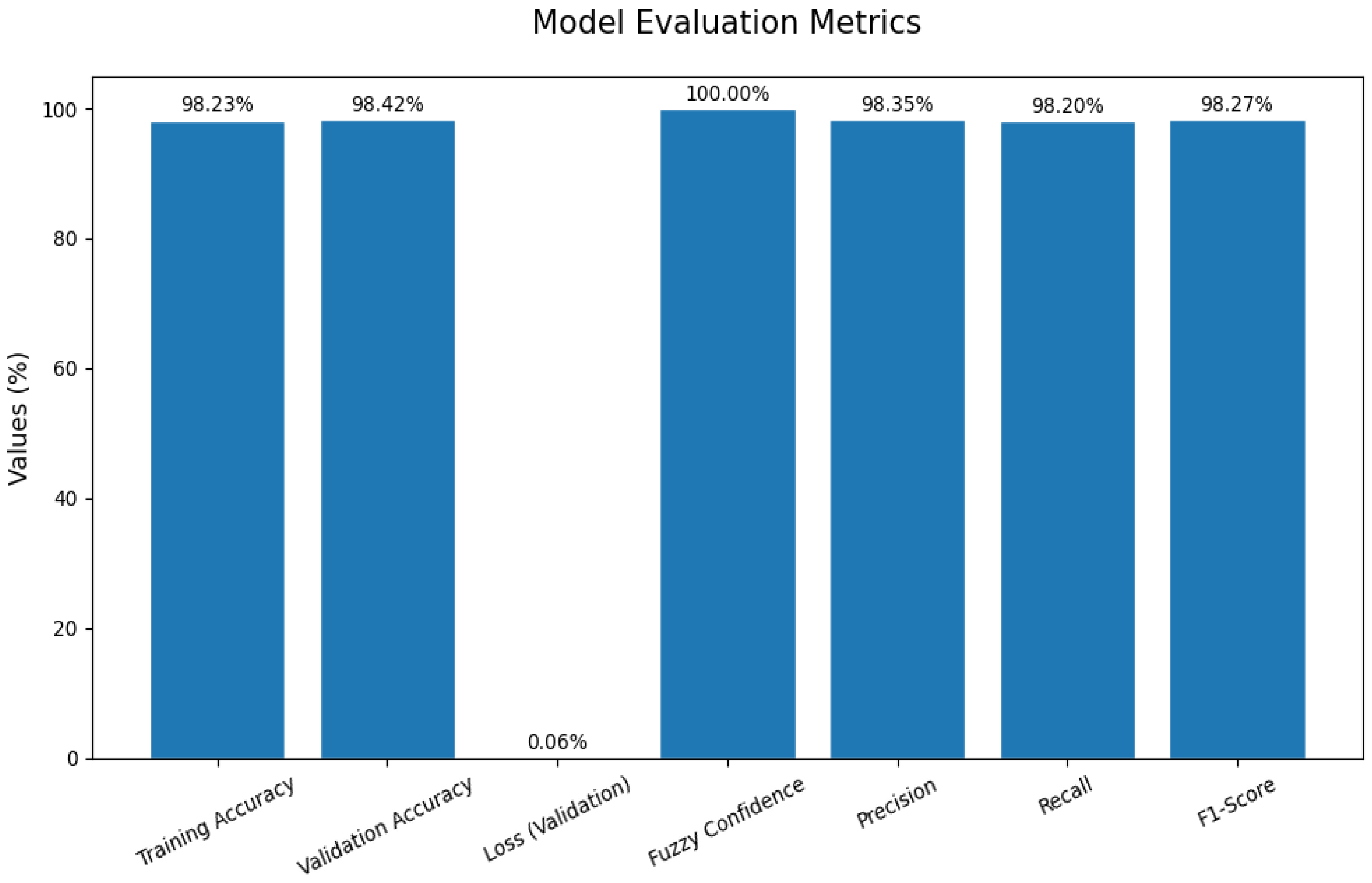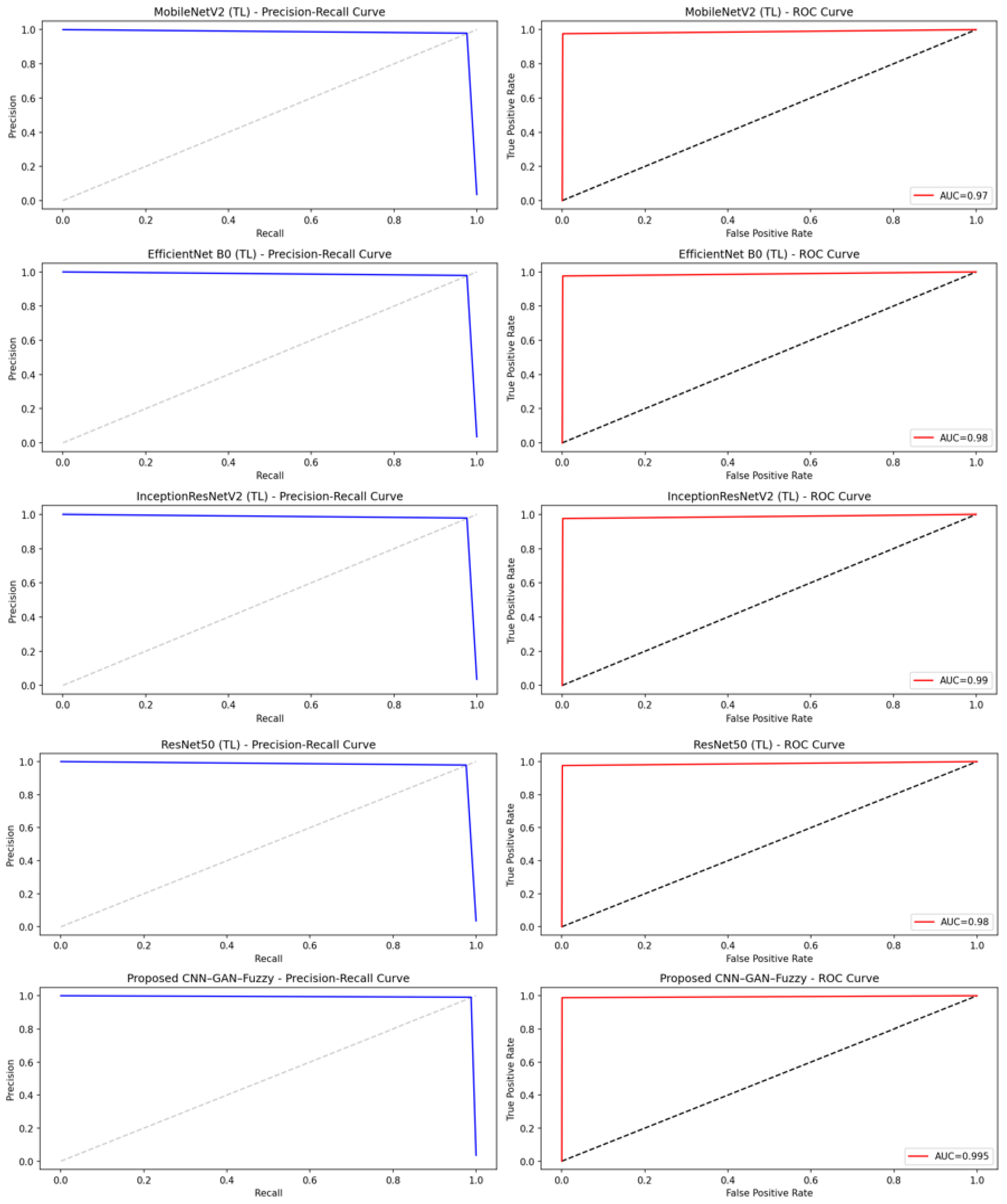 Table 11, the proposed CNN–GAN–Fuzzy model achieves the best overall performance, with an accuracy of 98.42% and near-perfect precision and recall. This gain is not solely attributable to network depth, but also to GAN-based synthetic augmentation, which enriches the training distribution, and to the fuzzy inference stage, which stabilizes decisions in borderline cases.