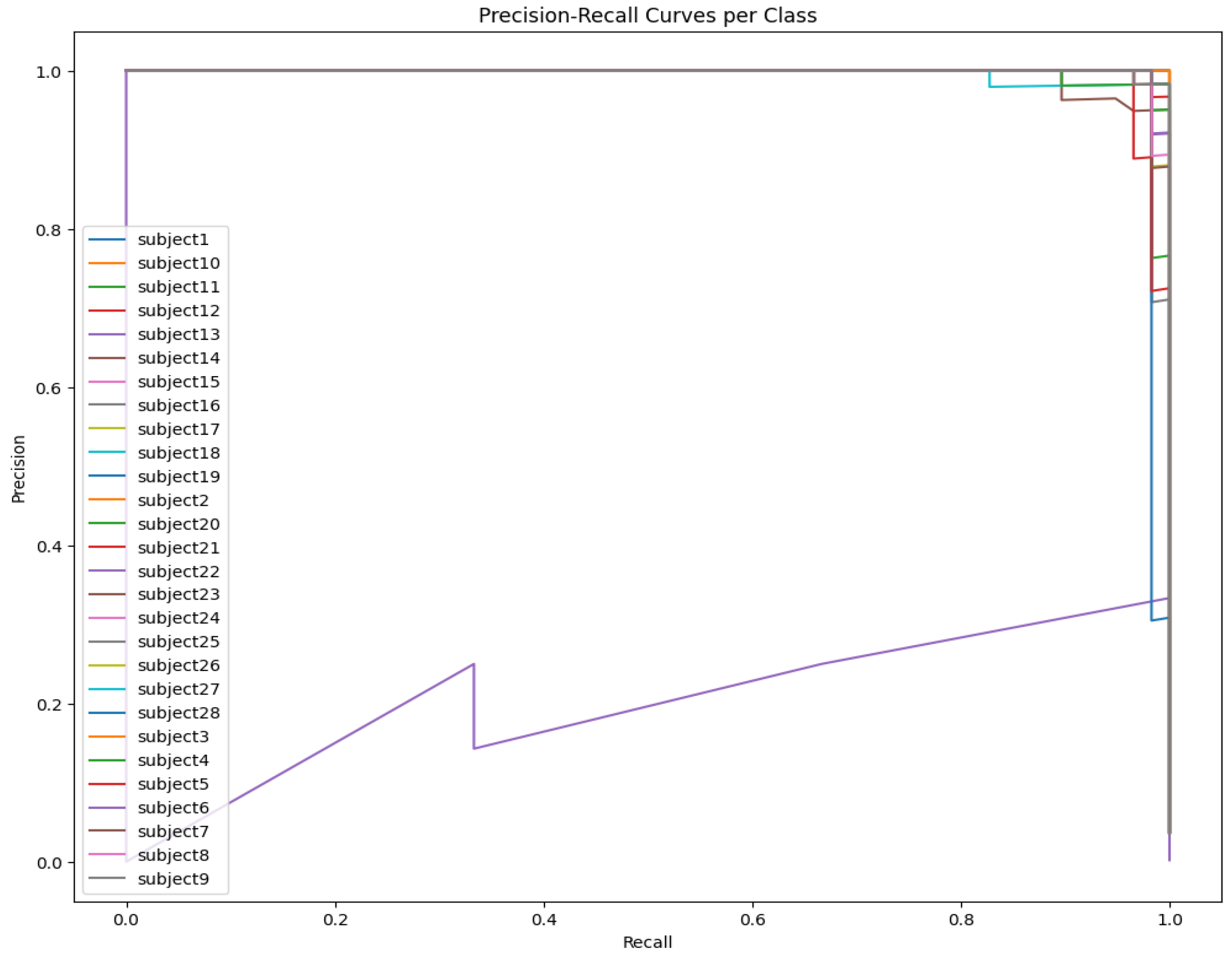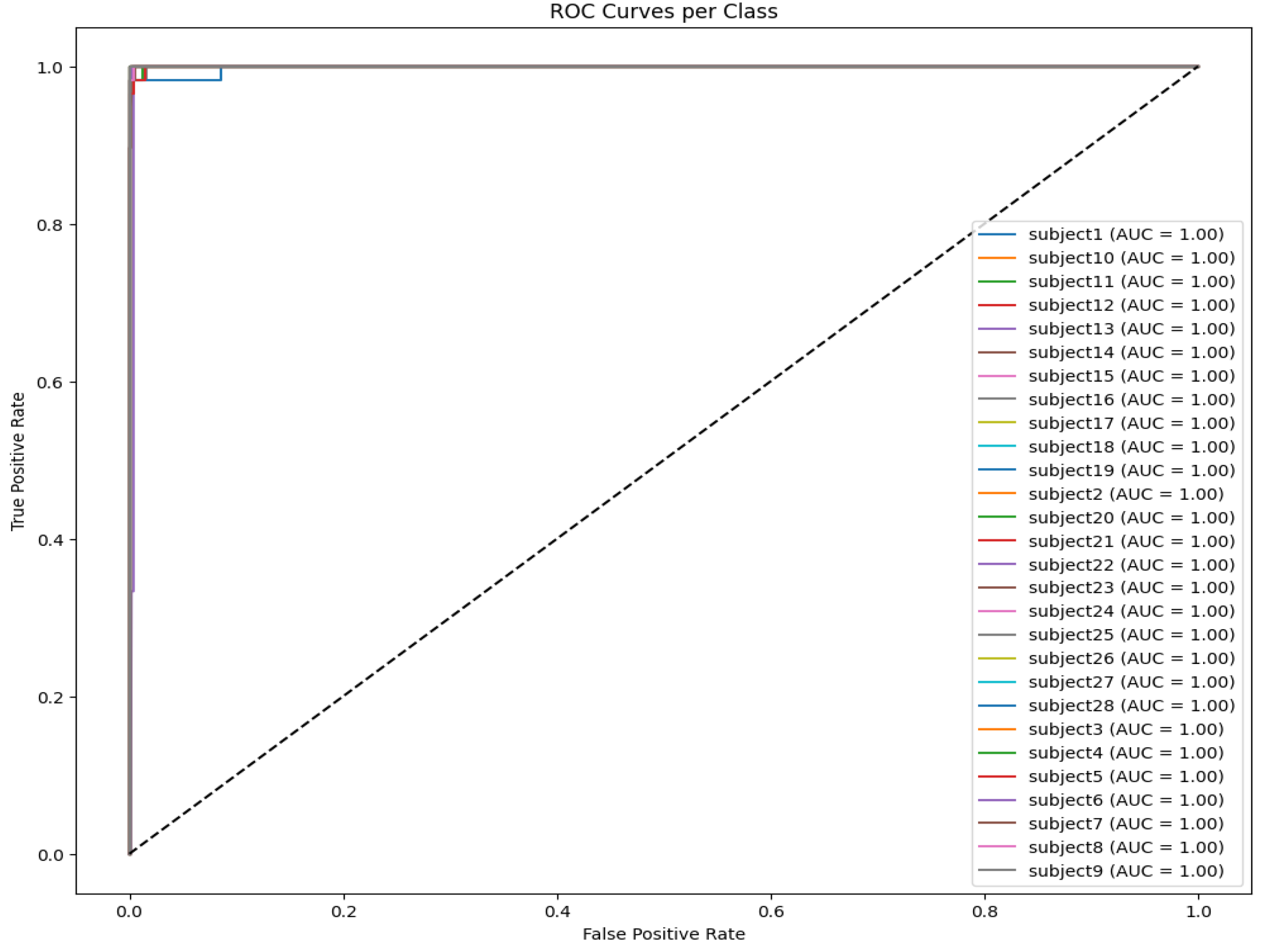 The proposed sequential GAN–CNN–Fuzzy model demonstrates strong identity recognition performance across the five evaluated subjects, achieving an overall F1-score of 98.3%. As shown in