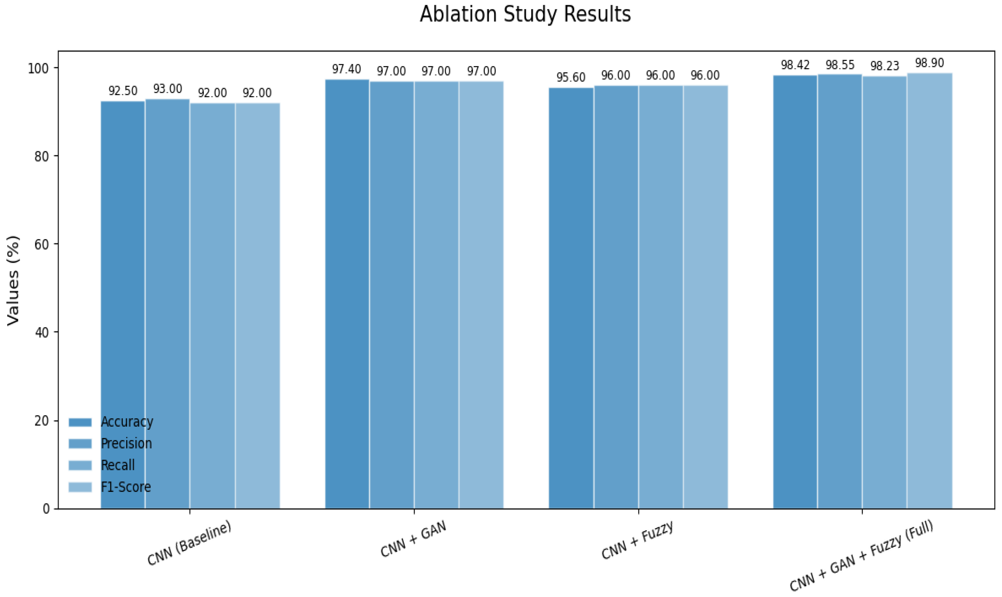 A comprehensive ablation study was conducted to quantify the individual and combined contributions of each module. Results demonstrate that GAN-based augmentation, fuzzy inference, and regularization techniques each contribute significantly to performance gains, with the complete framework achieving the highest accuracy and robustness compared to partially ablated variants and conventional CNN architectures.
