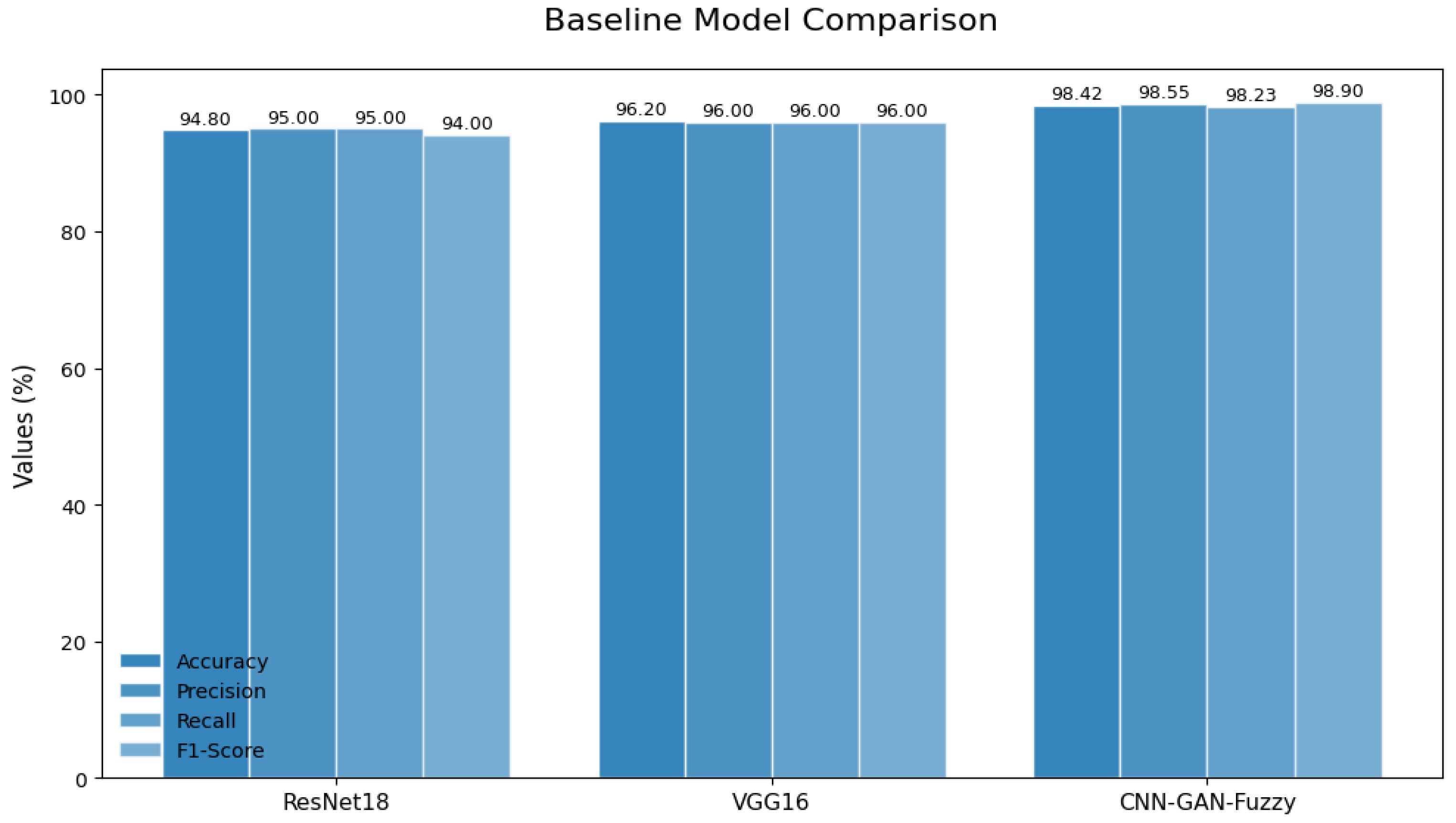The proposed model was compared against commonly used CNN architectures such as ResNet18 and VGG16 to put the results into perspective. ResNet18 achieved 94.8% accuracy and VGG16 reached 96.2%, yet neither attained the highest classification performance. In contrast, the GAN–CNN–Fuzzy model achieved an outstanding accuracy of 98.42%, clearly outperforming all baseline models across every evaluation metric.