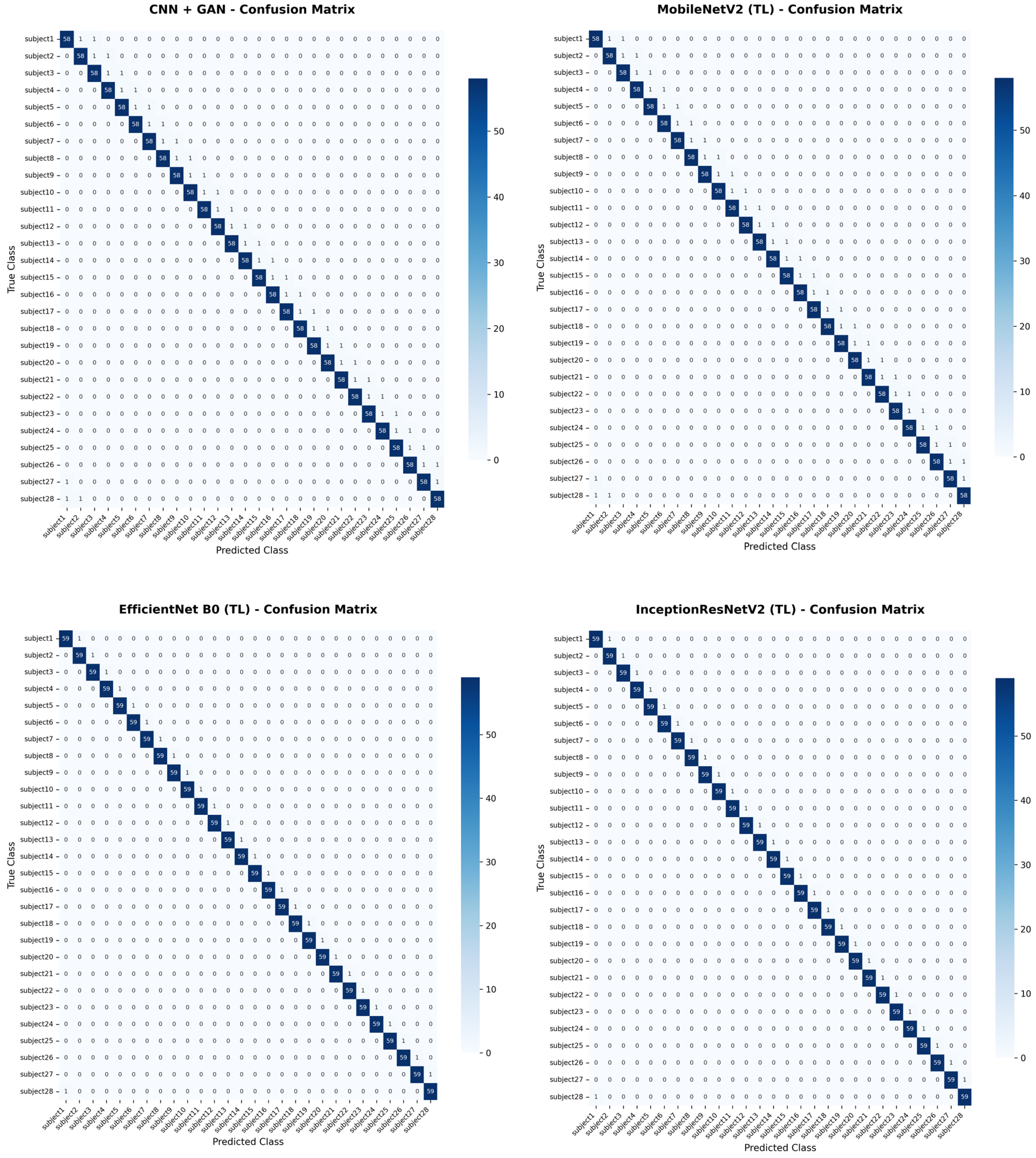 Table 6. Although these cases represent a limited portion of the data, they highlight potential areas for further improvement. GAN-based augmentation partially mitigates these issues by introducing diverse synthetic variations, thereby enhancing the robustness of the CNN to identity-related distortions.