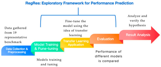 The RegRes framework is shown in Figure 1. The model starts with data collection and preprocessing, and uses data collected from 19 representative benchmarks as the basis. Then it entered the model training and fine-tuning stage, focused on the optimization of the regression model, and compared it with a deep neural network. Next is the transfer learning application, which realizes cross-platform and cross-code prediction by training the model in the source domain (e.g., a high-performance host, such as Intel x86) and transferring its knowledge to the target domain (e.g., a low-performance host, such as Apple ARM M1) or different code types. In the evaluation stage, the performance of different models is compared and evaluated. Finally, the hypothesis is verified through the result analysis, providing practical insights for software engineers. The framework emphasizes efficient prediction in the context of data scarcity, highlighting the advantages of transfer learning and regression models.