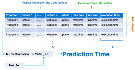 To explore the relationship within the datasets (in Figure 2), we define the execution time that we aim to predict as , and we represent each training program as a feature vector (see Equation (1)). The feature vector comprises features ranging from to , encapsulating runtime statistics for each benchmark (e.g., execution duration, maximum and minimum overhead times) along with machine physical information and code features. Using transfer learning integrated with various machine learning methods, we aim to learn the mapping relationship between and as represented by Equation.