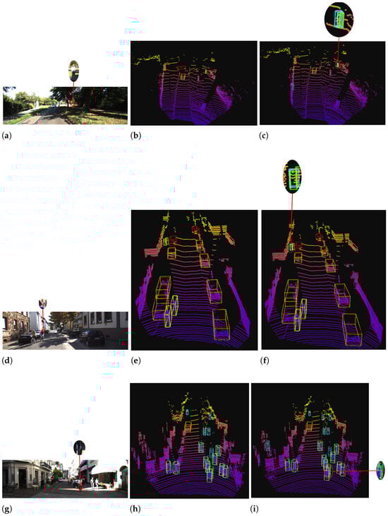 Visualization of detection results on the KITTI validation set. (a,d,g) represent the reference 2D images. (b,e,h) show the results of Voxel R-CNN, while (c,f,i) display the results of VFR-Net. Green boxes indicate the ground truth, while red, light blue, and yellow boxes represent the predicted cars, pedestrians, and cyclists, respectively. As highlighted by the circles, VFR-Net accurately detects small and occluded objects that the baseline failed to recognize, demonstrating its effectiveness.