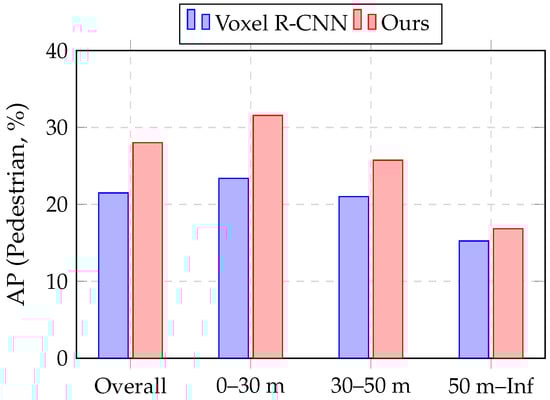 Furthermore, the distance-wise results indicate that our method effectively leverages fine-grained geometric details, especially at shorter ranges. In the 0–30 m range, the Pedestrian AP improves by +8.17% (from 23.39% to 31.56%). Figure 6 visualizes the distance-wise AP comparison for the Pedestrian class on the ONCE validation set, showing that VFR-Net achieves substantial accuracy gains in the near-range region and maintains competitive performance at longer distances. These results suggest that VFR-Net enhances feature representation for small objects by capturing rich local context.