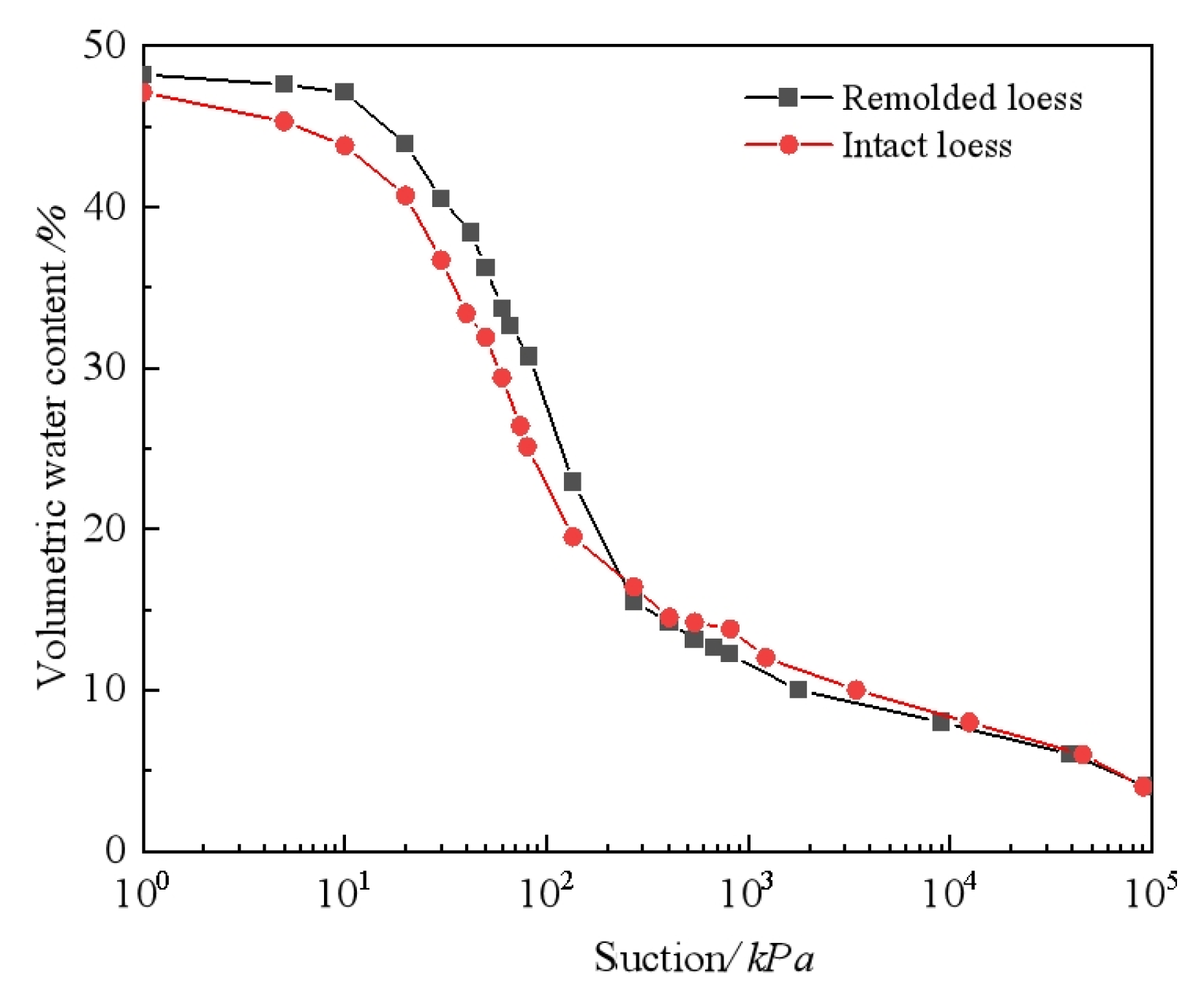 - For intact and remolded loess with identical dry densities, their SWCC exhibited notable differences. Specifically, when matric suction was below 103 kPa, intact loess showed lower matric suction at equivalent moisture content compared to remolded loess. However, this trend reversed when matric suction exceeded 103 kPa. These contrasting behaviors primarily stem from inherent differences in pore structure, despite identical dry density conditions. The intact loess exhibits a more developed pore structure characterized by larger inter-aggregate voids, which collectively lower its air-entry value. Simultaneously, its naturally cemented silt-clay structure enhances water retention capacity under high suction levels.