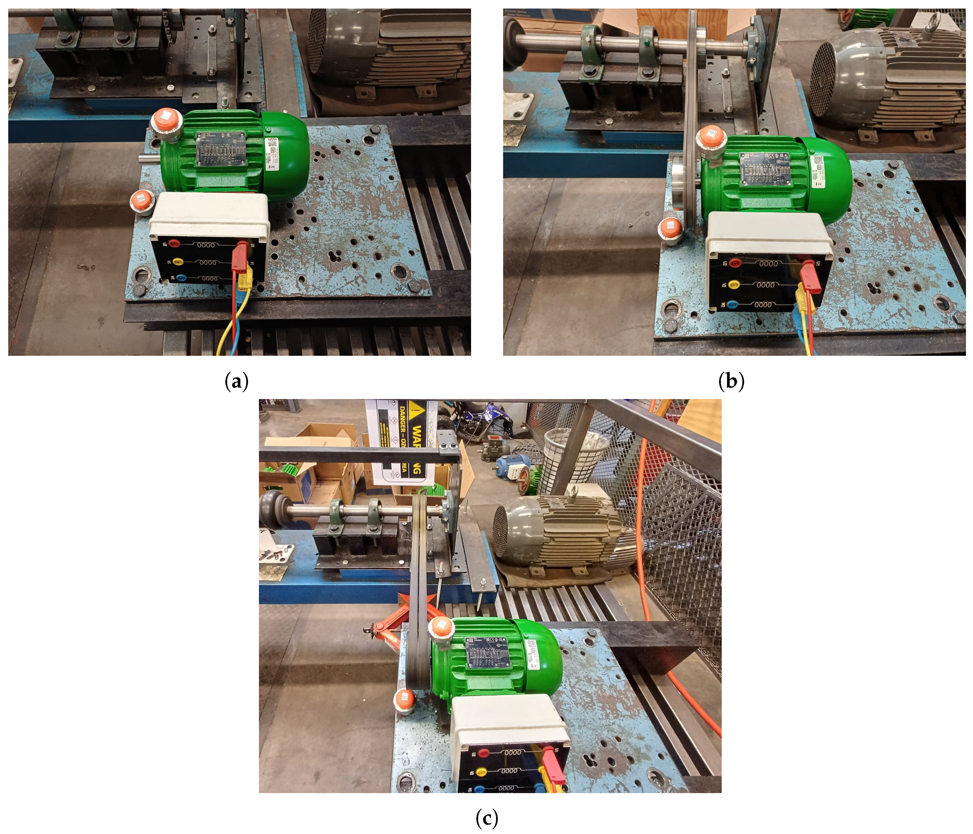 - V-belt pulley condition (Unloaded). The induction motor is coupled to the shaft connected to the load using a V-belt pulley coupling, but the load is not excited with a voltage, and therefore the motor only spins the shaft with no additional load, except for the friction of the components; see Figure 3c.