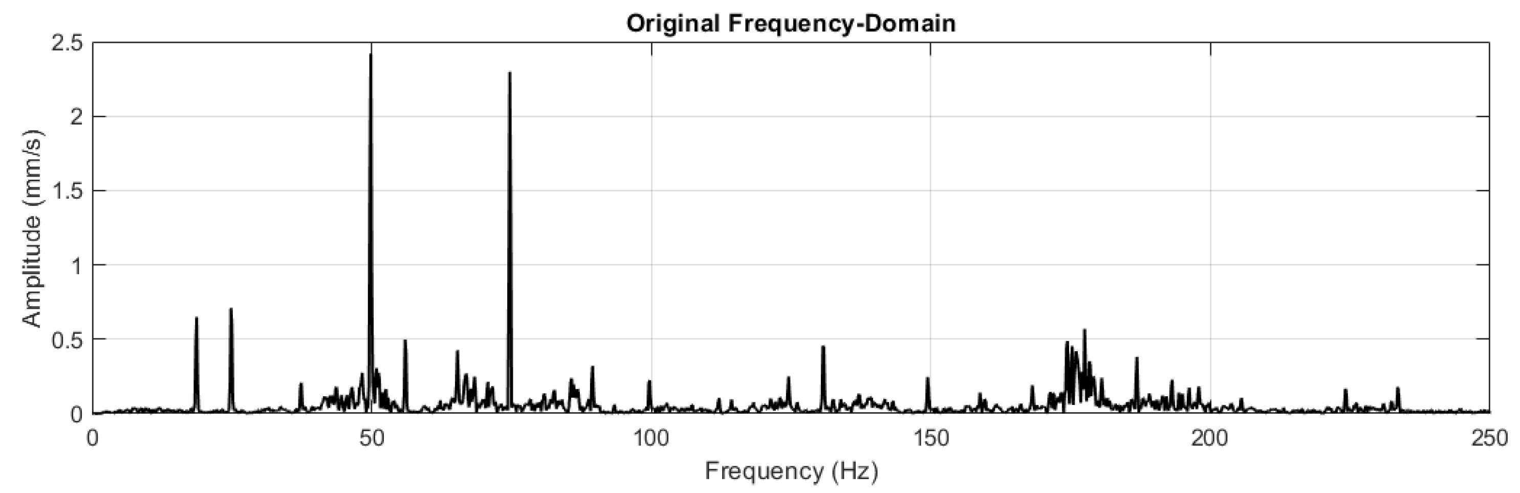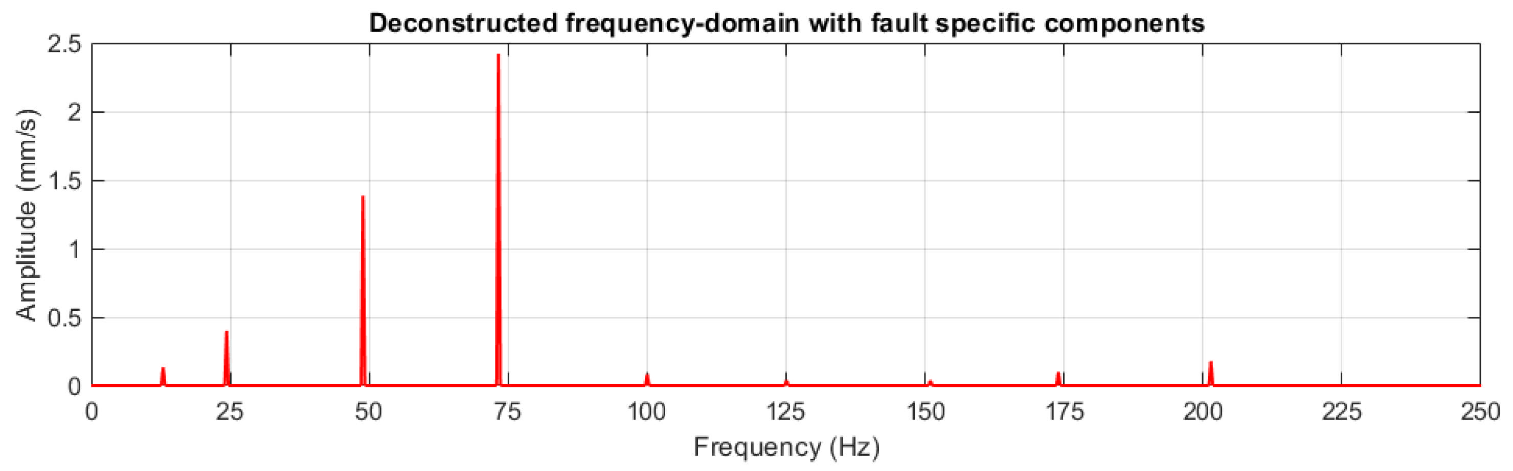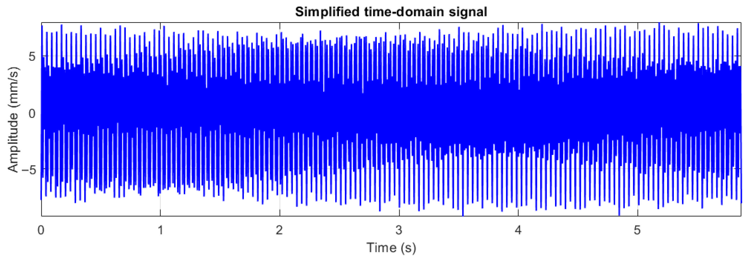 - Step 3: Harmonic amplitude calculation: Amplitudes for the 2× and 3× harmonics are computed as proportions of the fundamental amplitude, constrained by established vibration analysis practice [30]: where , and where . Supply frequency components (50 Hz and 100 Hz) are included at amplitudes consistent with healthy motor electromagnetic behaviour.