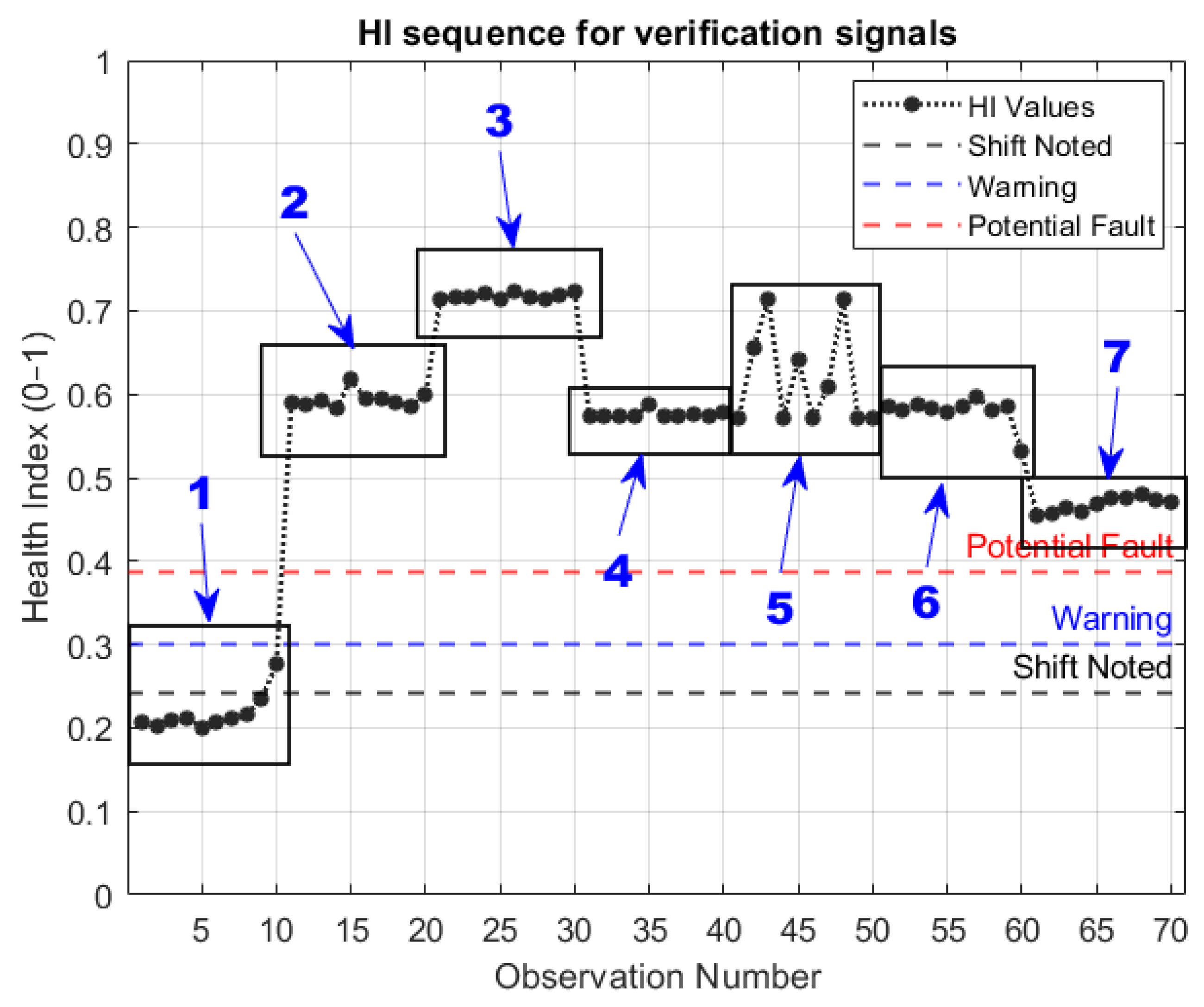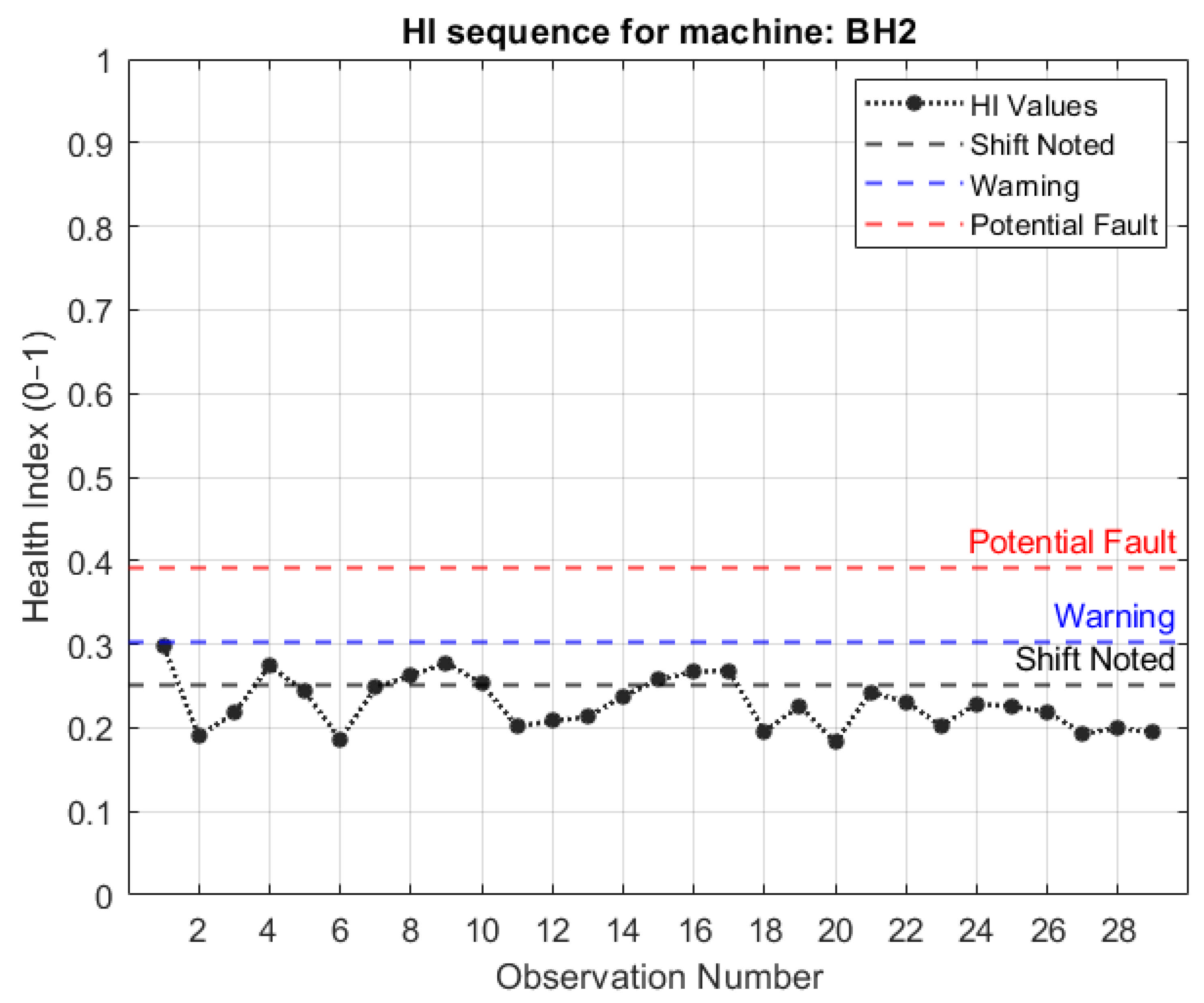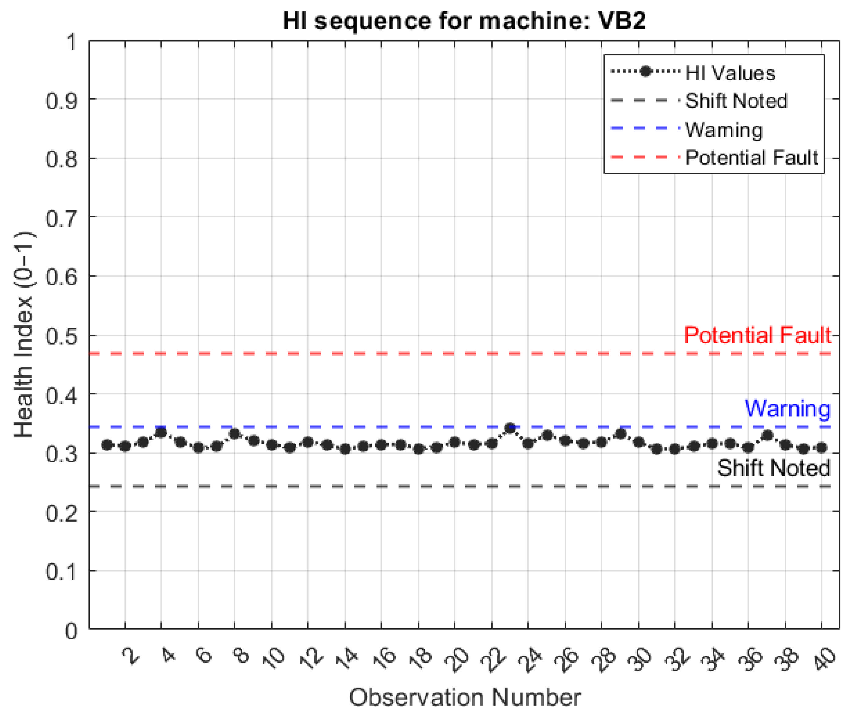 - Shift noted—A shift is noted when the HI of the new signal lies outside of the 95th percentile of the computed HIs of the healthy baseline data;