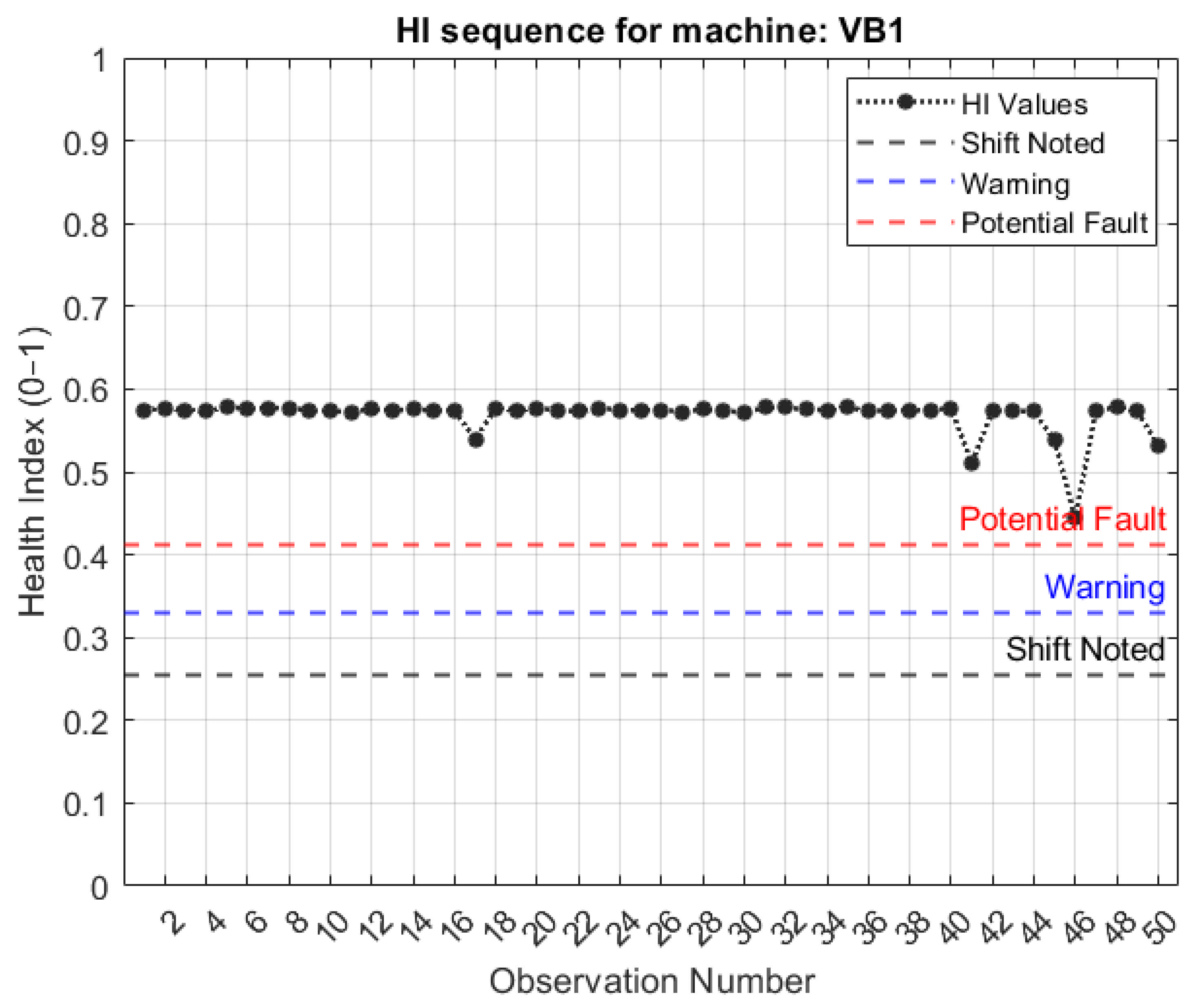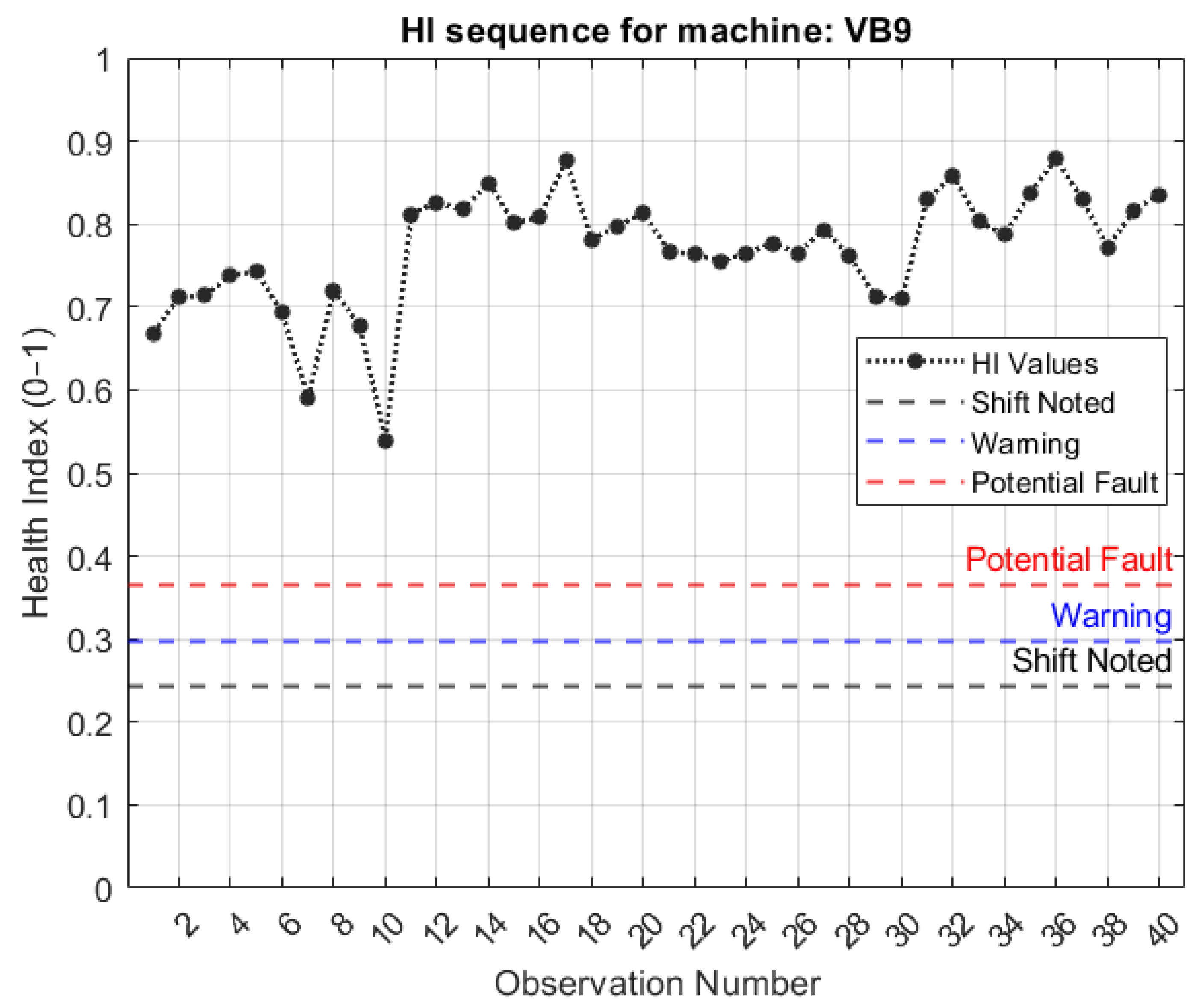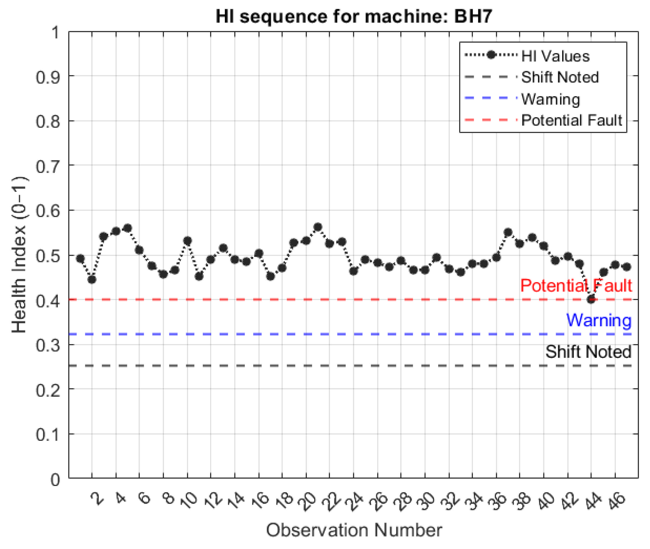 - Shift noted—A shift is noted when the HI of the new signal lies outside of the 95th percentile of the computed HIs of the healthy baseline data;