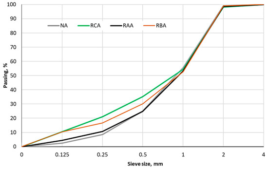 NA was obtained from a commercial retail supplier (Bauhaus, Croatia). RCA was produced by a mobile on-site crusher from concrete specimens remaining after various laboratory tests. The composition of the original concrete is unknown. RAA was reclaimed by milling the surface layer of a deteriorated asphalt pavement in the city of Sisak, Croatia, with unknown composition. RBA was prepared using a laboratory crusher from bricks of unknown properties, sourced from brick specimens remaining after various laboratory tests. After crushing or milling the source material, it was sieved to the 0/2 mm fraction. Because the origin of recycled aggregate is unknown, their density, water absorption rates and gradation were determined as shown in Table 2. The density and absorption rates of NA, RCA, RAA, and RBA were determined in accordance with the EN 1097-6 standard [53].